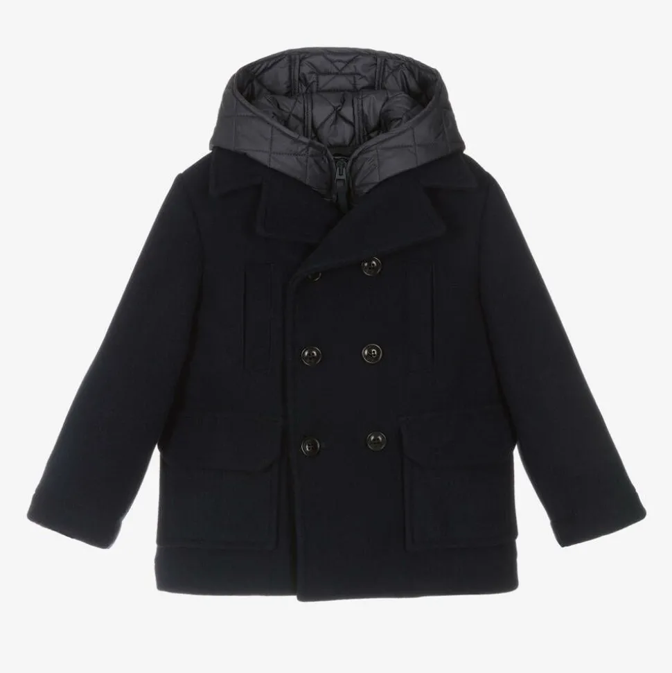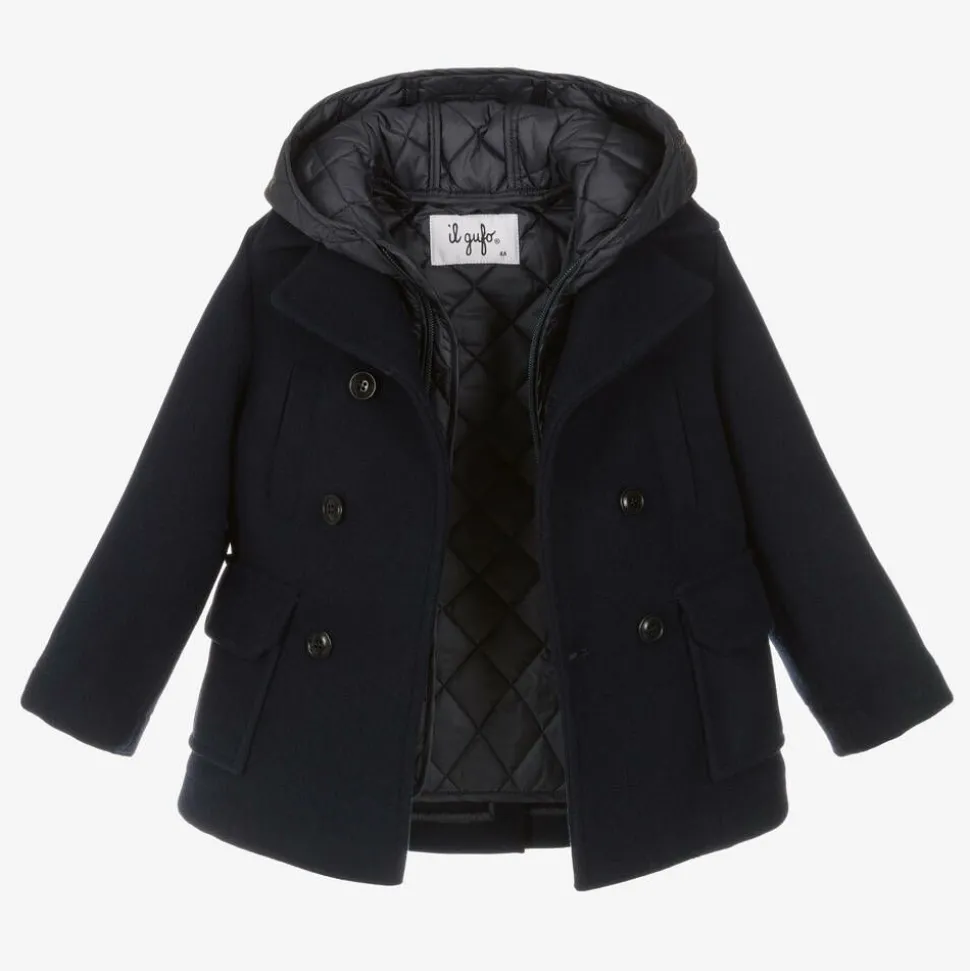 Boys traditional navy blue coat and gilet from luxury Italian brand Il Gufo, in a versatile 2-in-1 style that can be worn together or separately. Made in soft felted fabric, the double-breasted classic coat has four pockets and button fastenings on the front. The quilted, hooded gilet is lightly padded for warmth and fastens easily with a zip.