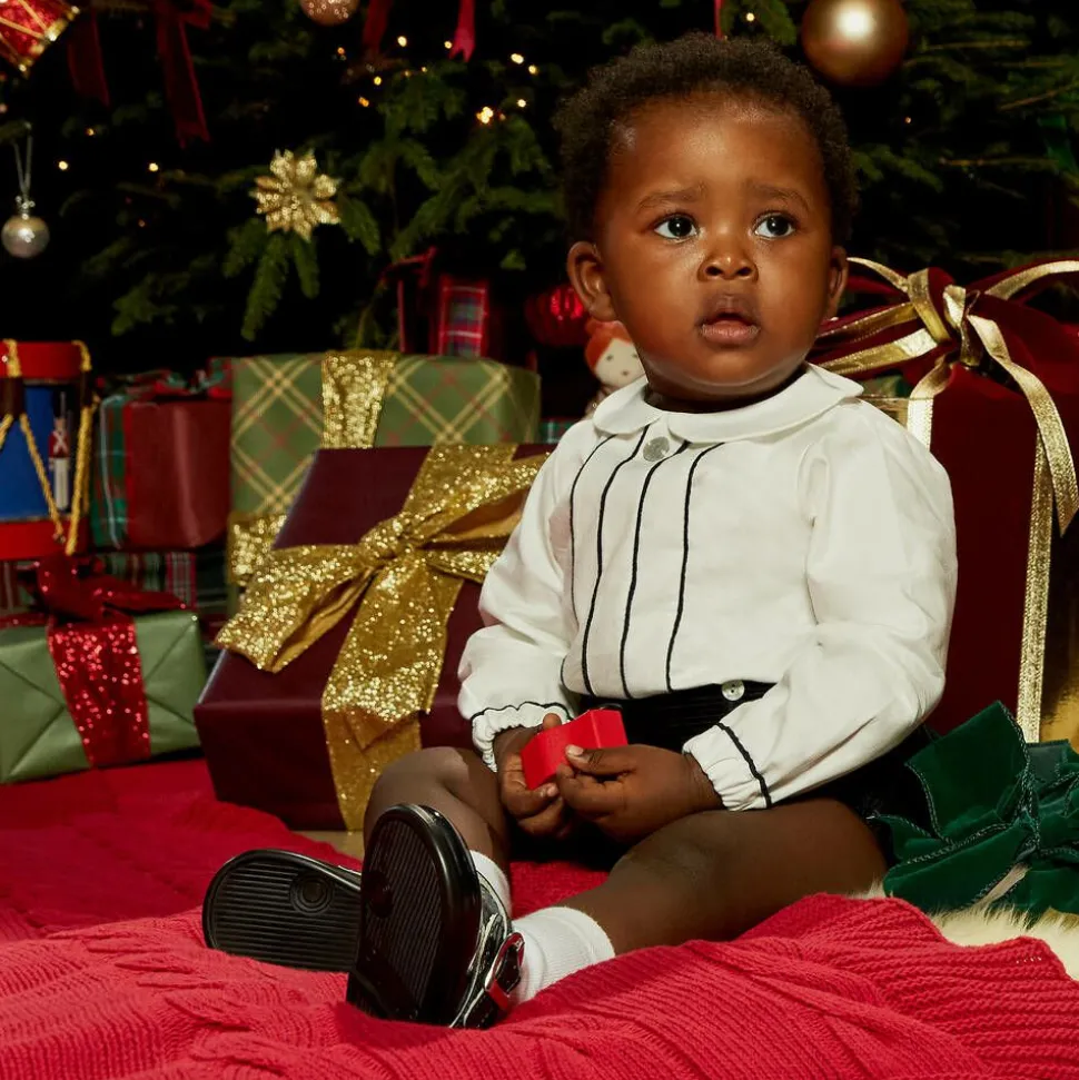 For little boys, these smart navy blue first-walker shoes are from British brand, Early Days. They are made in soft, flexible faux patent leather. There is an adjustable silver buckle on the side. They are lined in white fabric, lightly cushioned and the non-slip outer soles are made of soft, flexible black rubber.