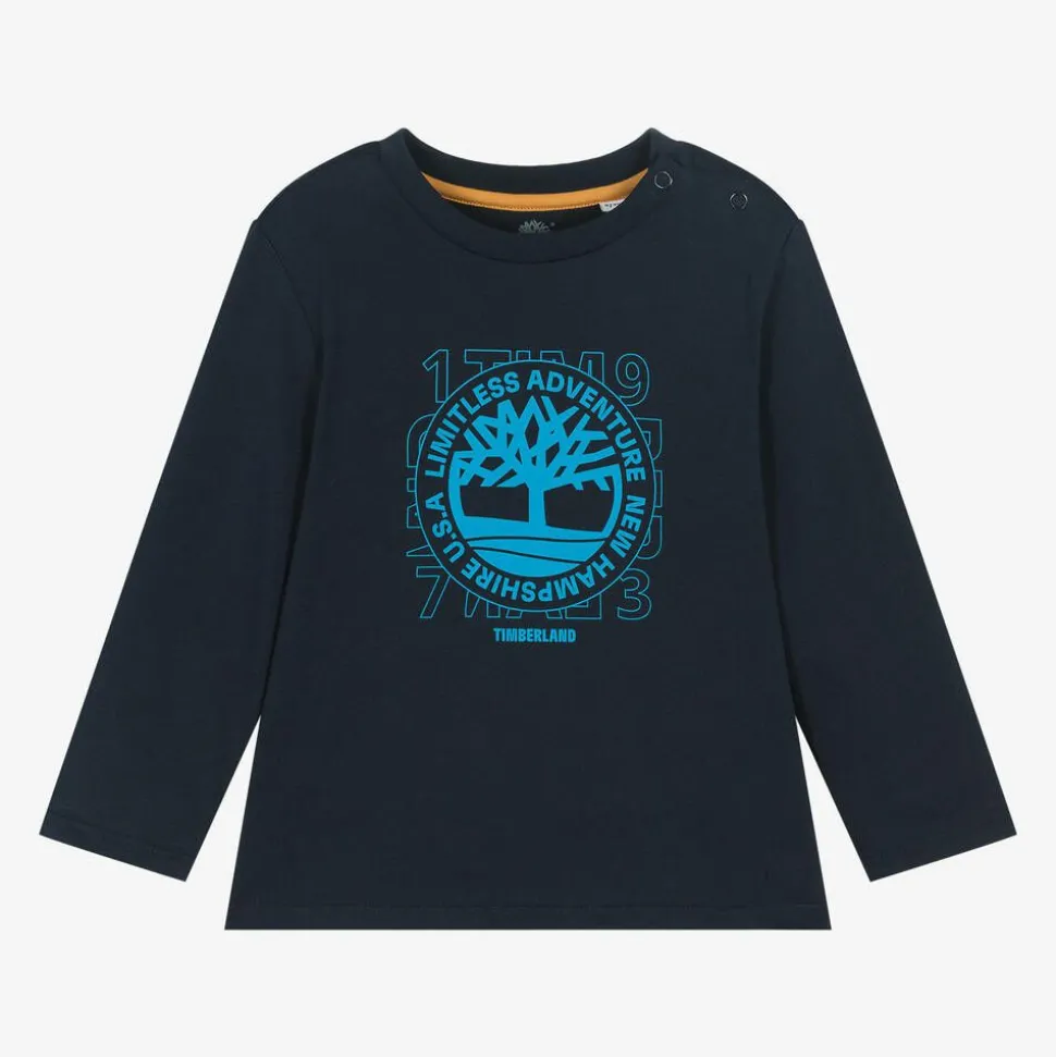 Navy blue long-sleeved top for little boys by Timberland, made in soft and comfortable organic cotton jersey. For instant designer appeal, it has a contrasting blue logo print on the front, featuring the brand's distinctive tree motif. This casual crew neck style is complete with popper fastenings on the shoulder for easy over-the-head dressing.