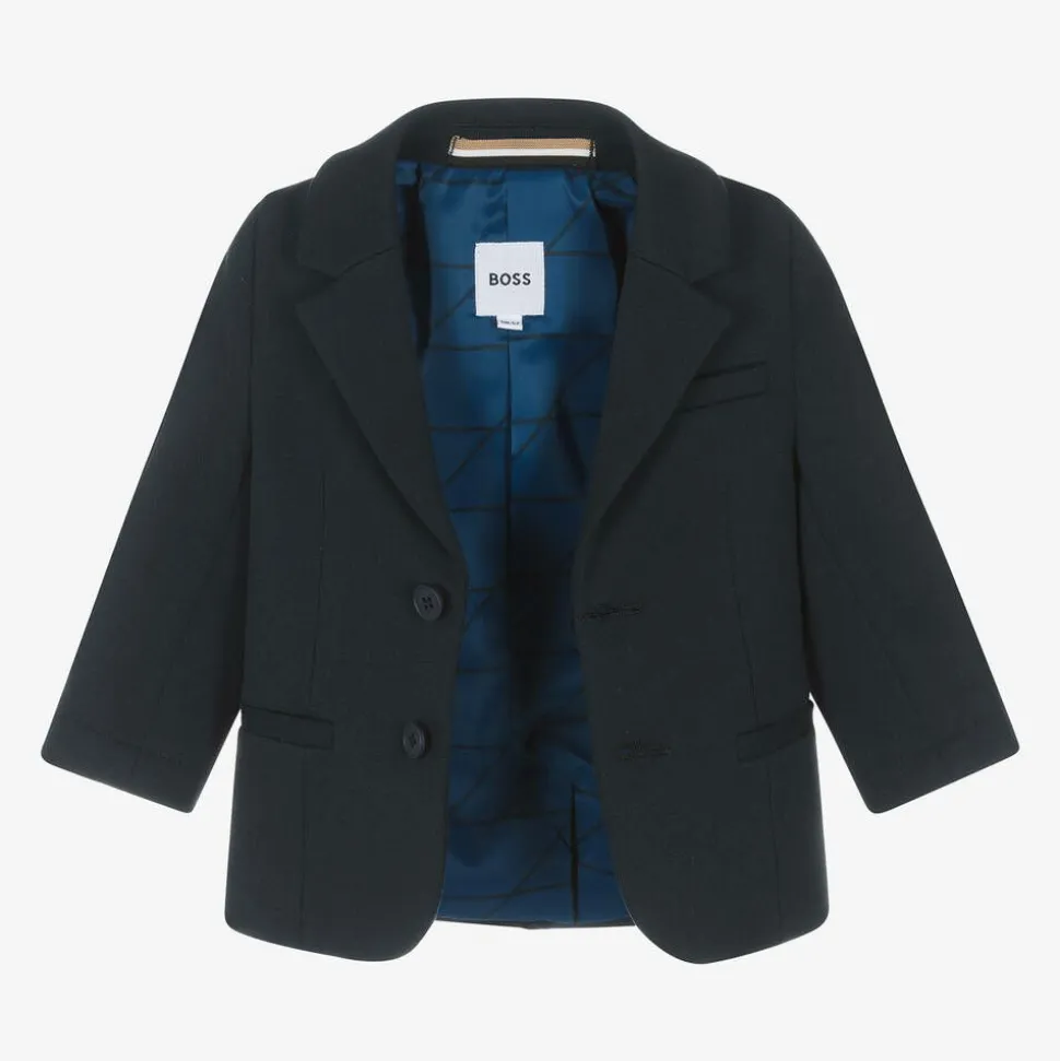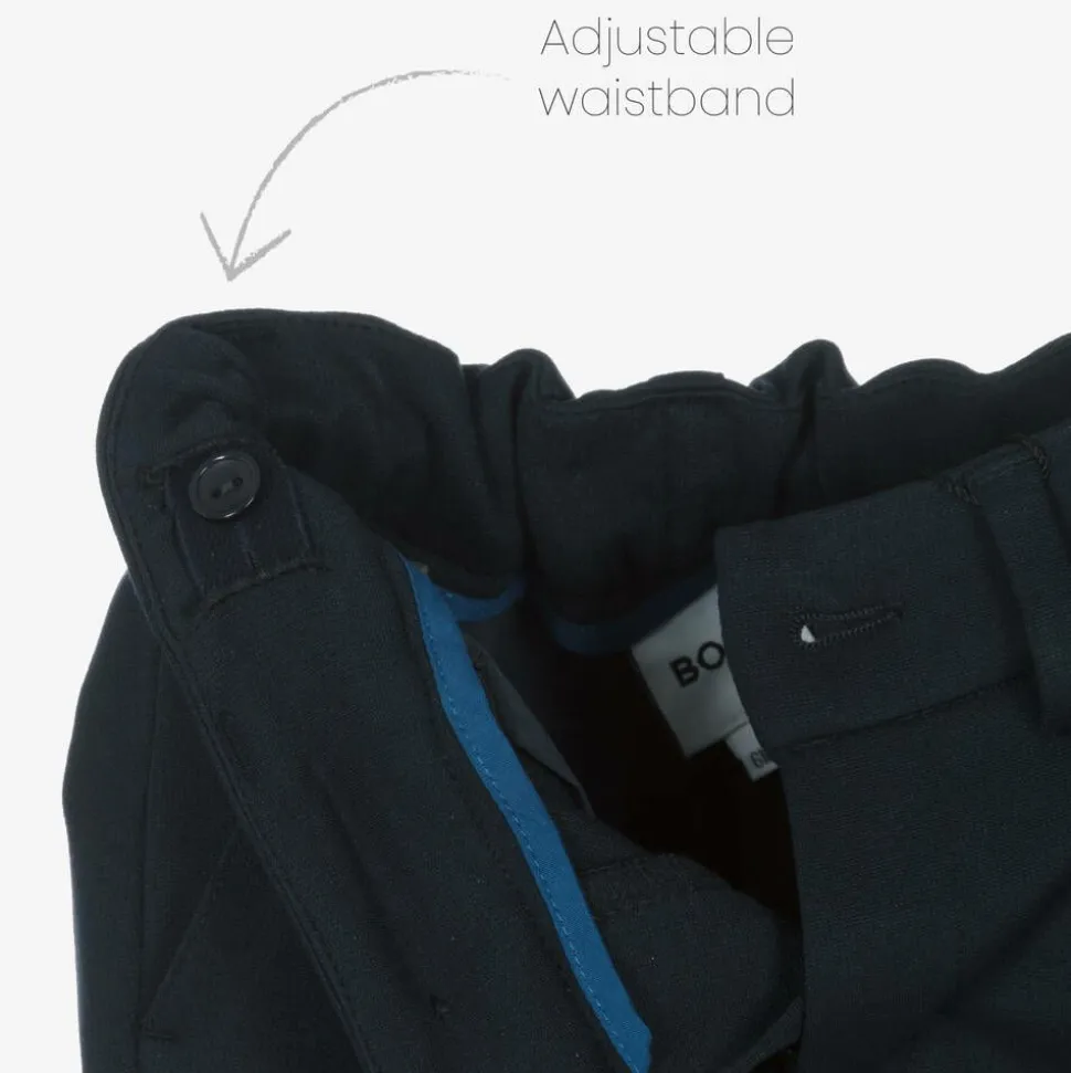 A navy blue suit for younger boys by BOSS, made in soft Milano jersey. Lovely for smarter occasions, the tailored blazer has a silky lining for comfort, pockets on the front and branded button fastenings. The trousers have front and back pockets and fasten with a button and zip, with an adjustable waistband to ensure a comfortable fit. They are detailed with a tricolour-striped tab and have a rubberised logo on the back for designer appeal.