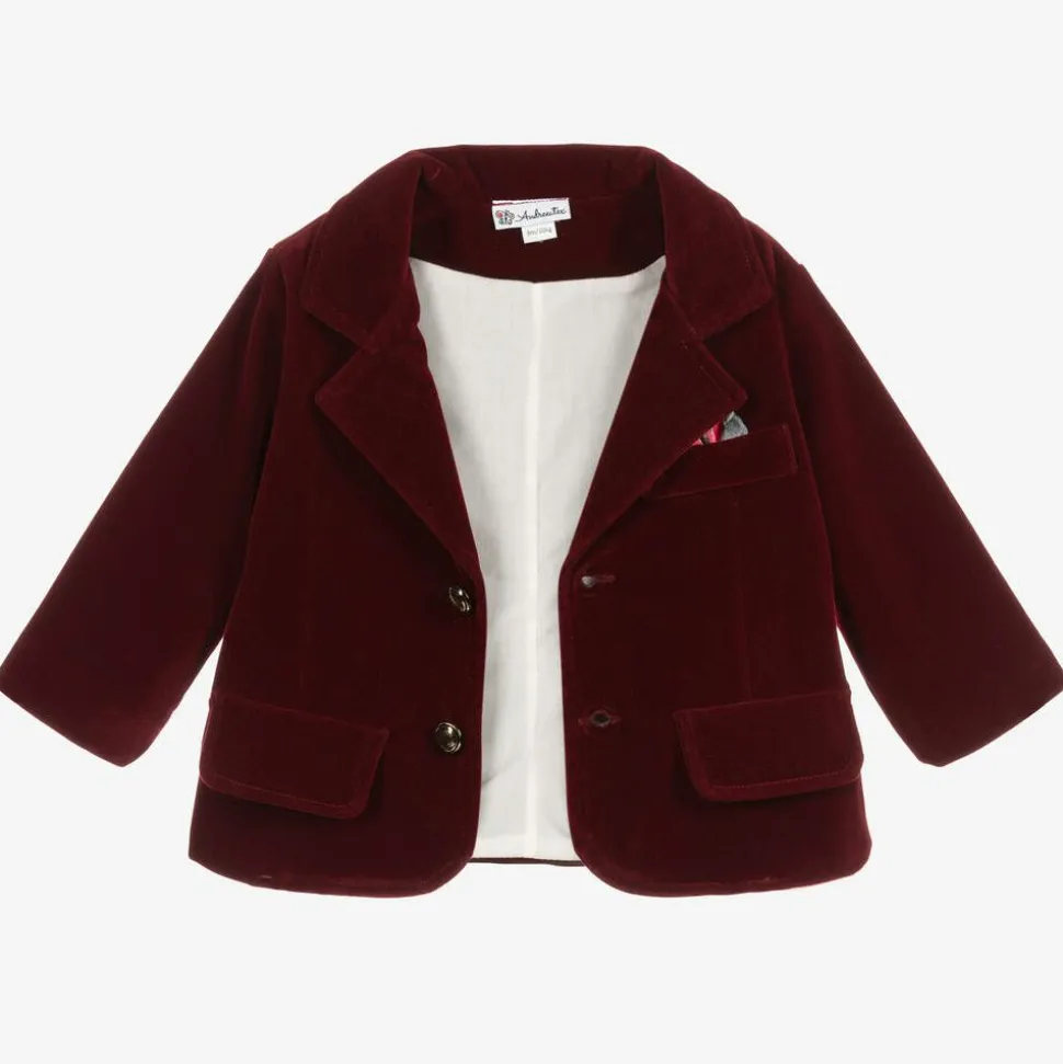 Smart suit for younger boys by Andreeatex, ideal for any special occasion. The burgundy red velvet jacket fastens with gold crest buttons and has a colourful pocket square to match the elasticated velvet bow tie. The navy blue twill trousers have a comfortable elasticated waistband, with a detachable satin cummerbund on the front. A white cotton shirt completes the set, it fastens with buttons on the front, trimmed with ruffles and red piping.