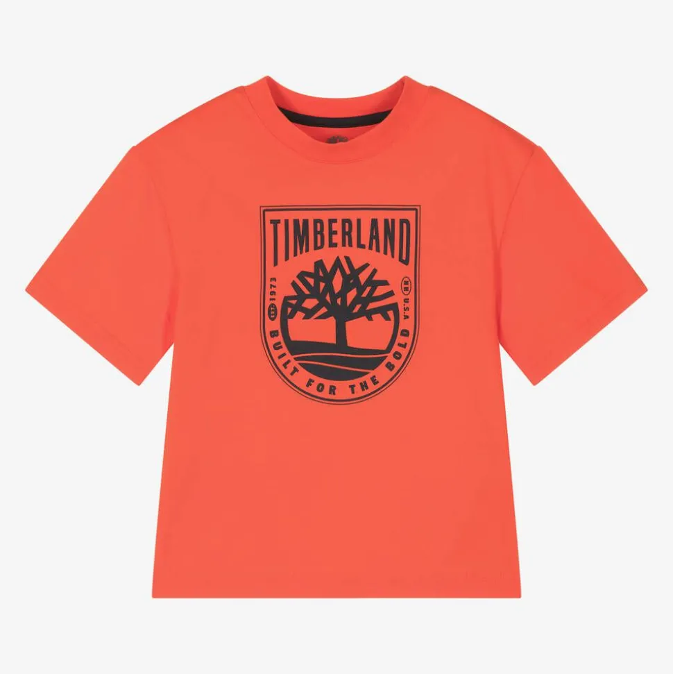 Bright orange cotton T-shirt for boys by American brand Timberland, with a large navy blue logo printed on the front. A timeless wardrobe essential, it is made in soft, comfortable jersey with a crew neck and navy blue overstitch detailing on the shoulders.