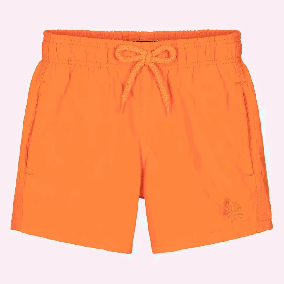 Orange water-reactive swim shorts for boys by luxury French brand Vilebrequin. Smooth with a lightweight mesh lining, a tonal abstract seashell pattern magically appears when the shorts are immersed in water. They have a faux drawstring detail on the front and a navy blue logo patch on the back of the comfortable elasticated adjustable waistband. Complete with side seam pockets and a velcro-fastened flap pocket on the reverse, there is an embroidered shell motif near the hemline.