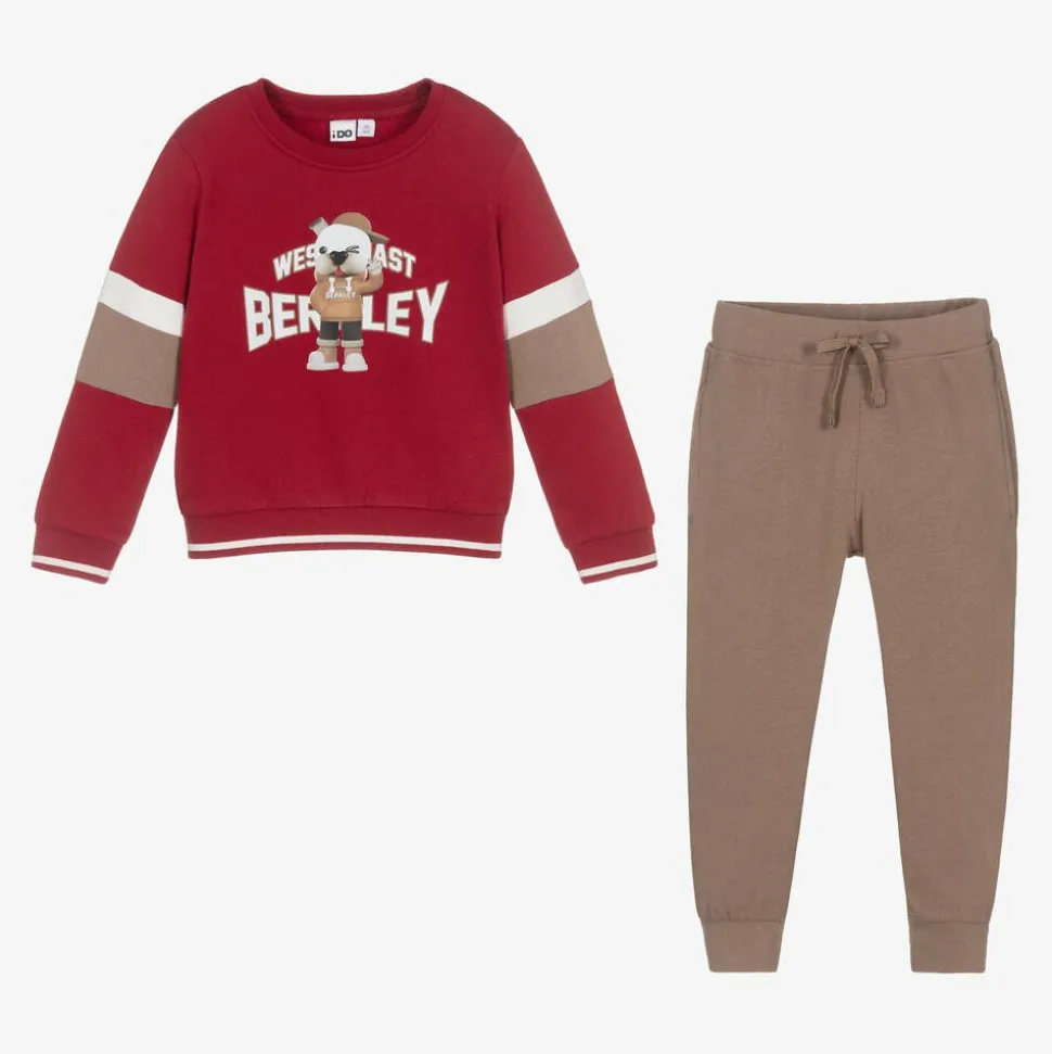 A red and beige tracksuit for boys by iDO Baby, made from soft cotton-blend jersey with a cosy fleecy inside. The long-sleeved sweatshirt is printed with a cool dog design and varsity-style lettering on the chest, with striped sleeves for a sporty, casual look. Smaller sizes have poppers on one shoulder to make dressing easier. The coordinating joggers have useful side seam pockets and an elasticated drawstring waist for comfort.