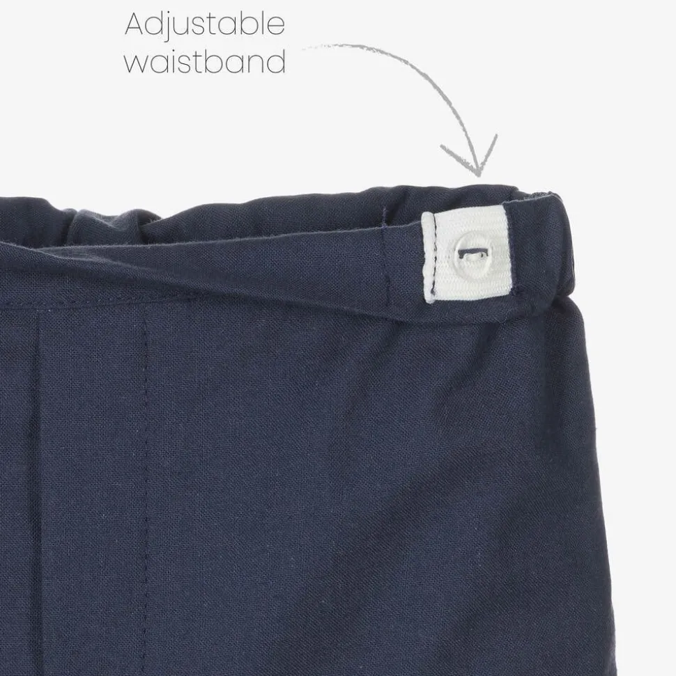 Smart and traditional, this red, white and navy blue sailor suit for little boys is by Andreeatex. The outfit comprises a cotton shirt, with a jacket, trousers and cap made in lightweight linen with a comfortable cotton lining. The easy pull-on trousers have an adjustable, elasticated waistband for a comfortable fit and the shirt comes with a detachable navy blue bow tie. Completing the look, the jacket and cap have navy blue nautical trims and the jacket has a lovely gold embroidered anchor on the chest and gold crest button fastenings.