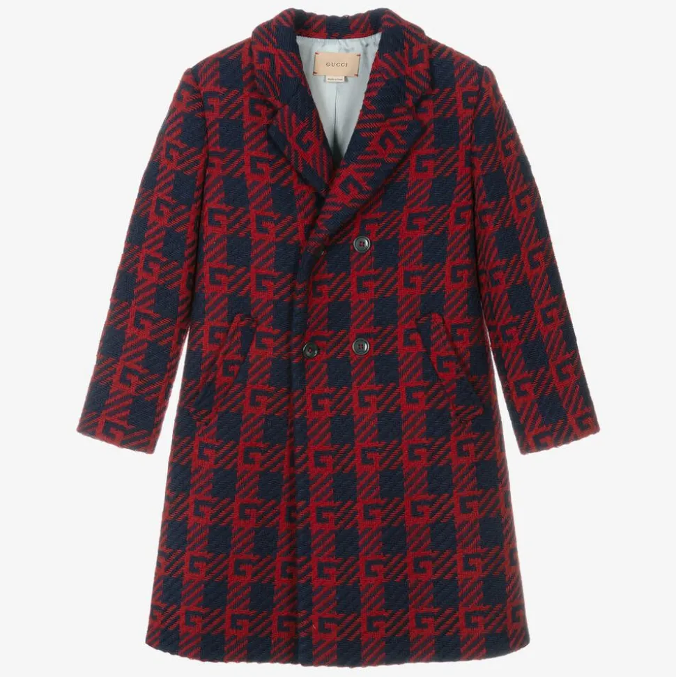 Vintage-inspired red and navy blue coat for boys from Italian luxury designer, Gucci. Elegant and traditional in style, it is made from woven wool with the brand's archival Square G design in a check pattern. Double-breasted, it has a stylish revere collar, front welt pockets and an inverted pleat on the back. The coat is beautifully finished with a pale blue satin lining.