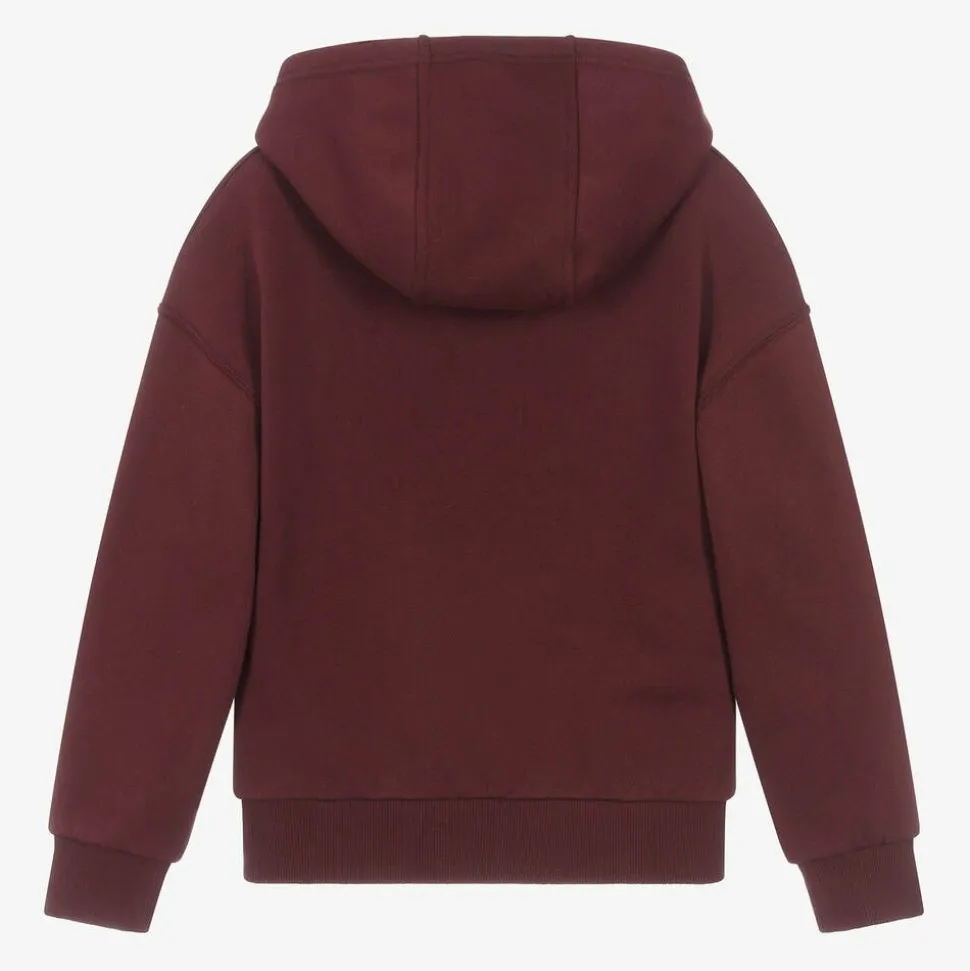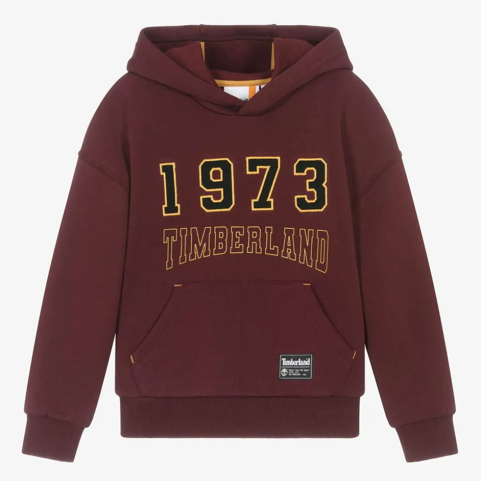 Burgundy red organic cotton hoodie for boys by American brand Timberland. Just right for relaxed days, it is made in comfortable, mid-weight jersey with a warm, fleecy inside and cosy ribbed trims on the long sleeves. Emblazoned across the front is a '1973' appliqué in black and yellow, the year the iconic Timberland boot was introduced, with a logo below. The hoodie has a useful pouch pocket with a logo patch on one side.