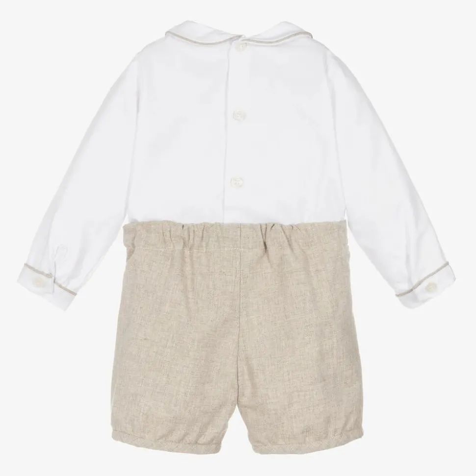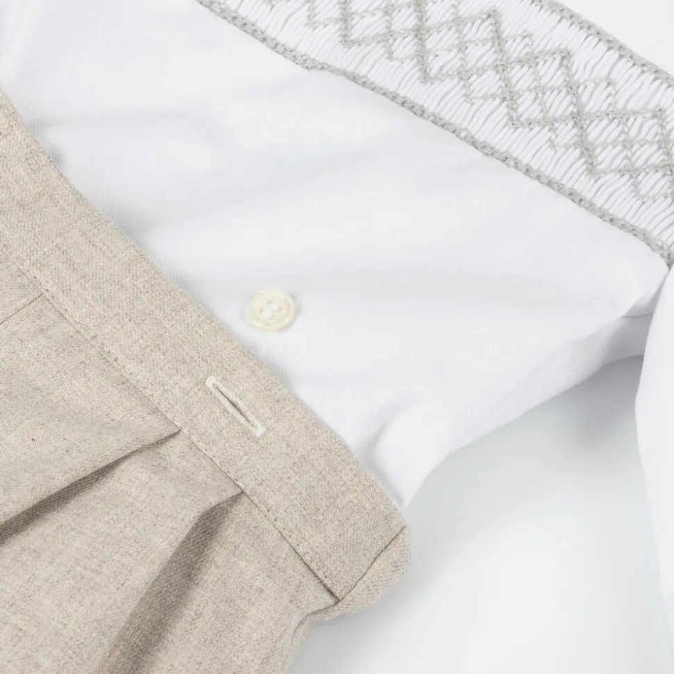 A traditional shorts set for little boys, handmade in soft cotton by Kidiwi. Pleated on the front, the beige shorts are gently elasticated at the back and fully lined for comfort. The white twill shirt has a sweet rounded collar, classic hand smocking across the chest, and coordinating piped trims. The two pieces button together for a neat and tidy finish.
