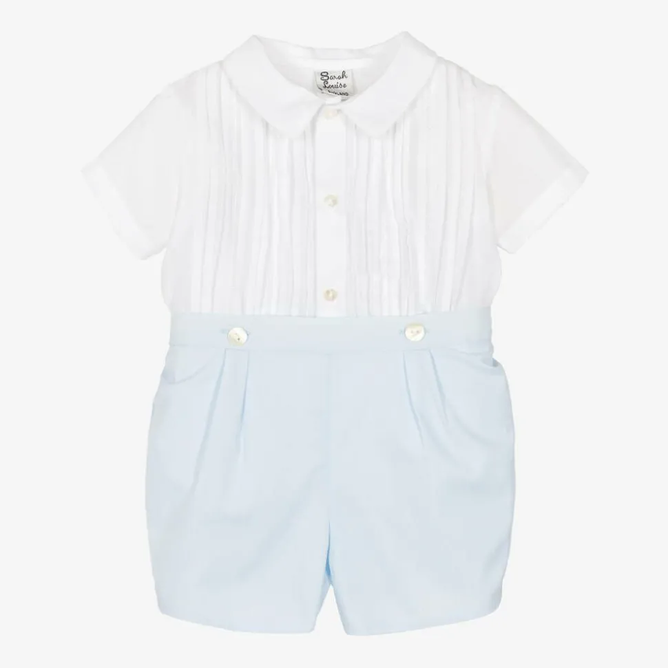 Smart and traditional, a white and pale blue cotton-blend shorts set for little boys by Sarah Louise, made in lightweight poplin. The shirt has beautiful, hand-embroidered pin-tuck detailing, whilst the lined shorts have an adjustable, semi-elasticated waist for a great fit. The shirt buttons onto the shorts, keeping boys neat and tidy.