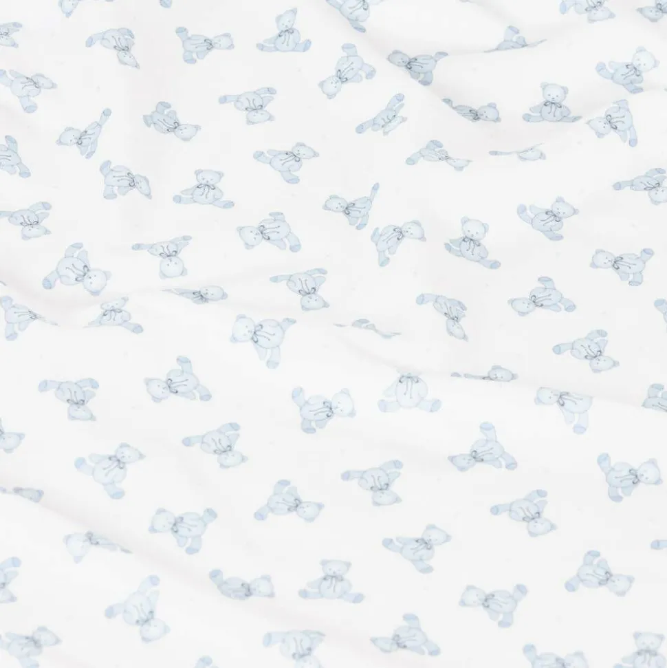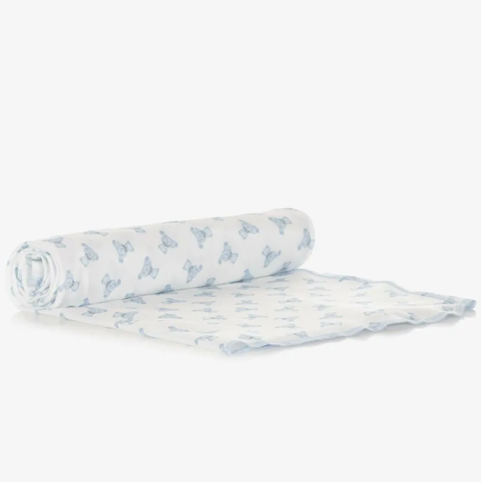 Sweet white and blue blanket for baby boys by Magnolia Baby, made in luxuriously soft Pima cotton jersey. Ideal for the nursery, this beautifully decorated blanket has charming blue teddy bears all-over and a blue stitched border.