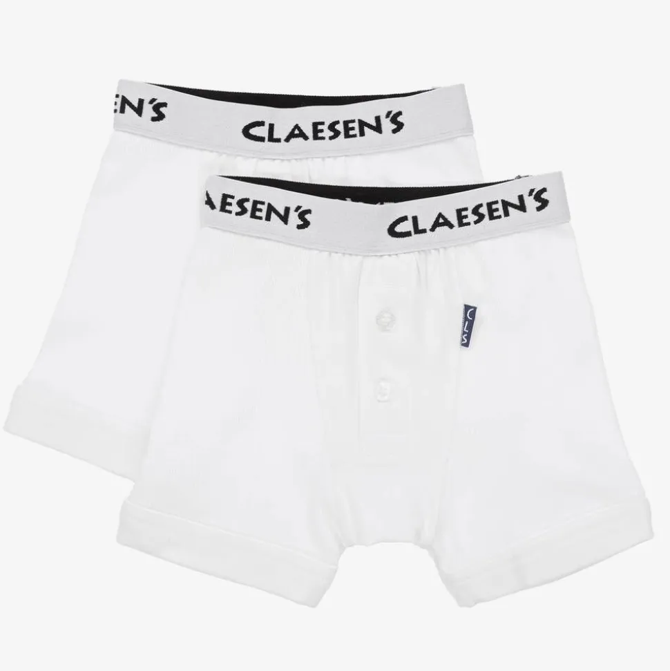 Pack of two white boxer shorts for boys by Claesen's, made in soft cotton ribbed jersey. Comfortable to wear, they have an elasticated waistband, with a repeat logo in black and button front fastenings.