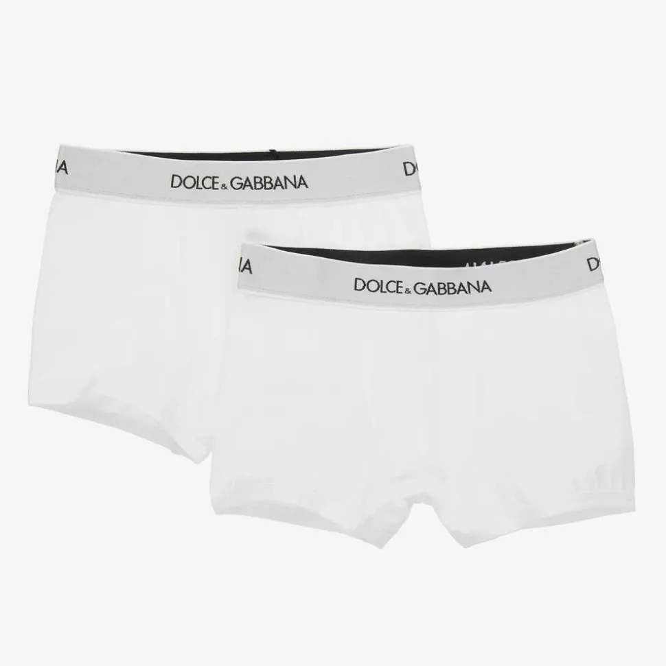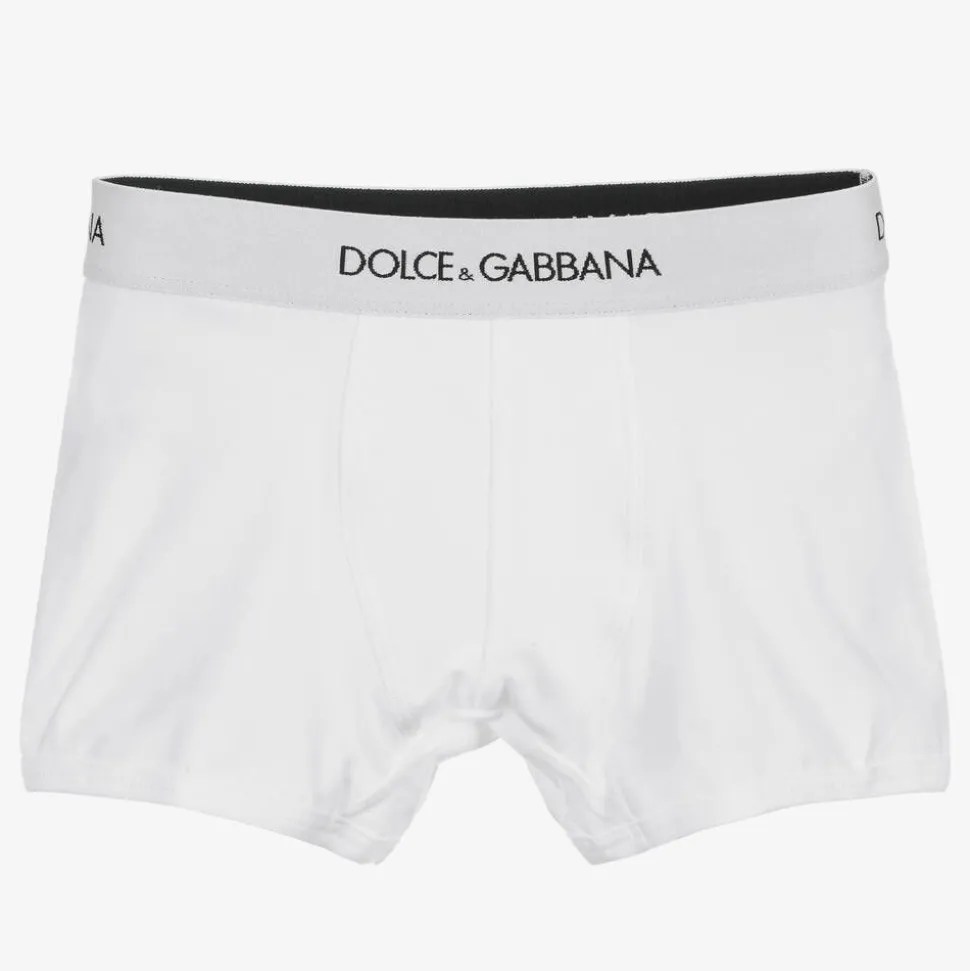 Boys white Mini-me boxer shorts by luxury Italian brand Dolce & Gabbana. Made in soft and stretchy cotton jersey, they have a black and white elasticated branded waistband for comfort and style.