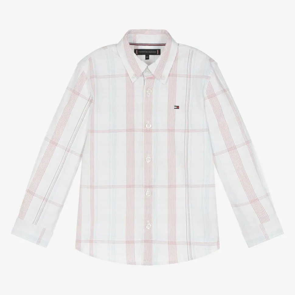 White shirt for boys by Tommy Hilfiger, made in soft cotton. It is patterned with checks in the brand's signature red, ivory and blue colours. Great for casual wear, it has a button-down collar and branded button fastenings on the front and cuffs. The iconic flag logo is embroidered on the chest for a subtle designer finish.