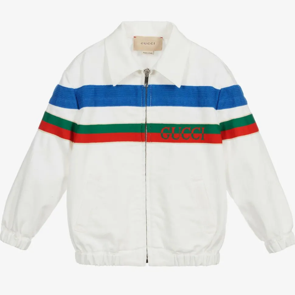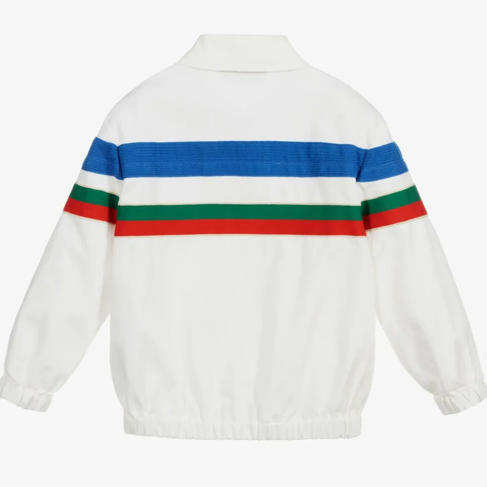 A stylish, off-white cotton twill jacket for boys from luxury brand, Gucci, inspired by the adult collection. This zip-up jacket has a green and red, Web striped logo jacquard trim, reworked from the band of the vintage tracksuit. The cuffs and hem are gently elasticated and there is blue taped trim on the top.
