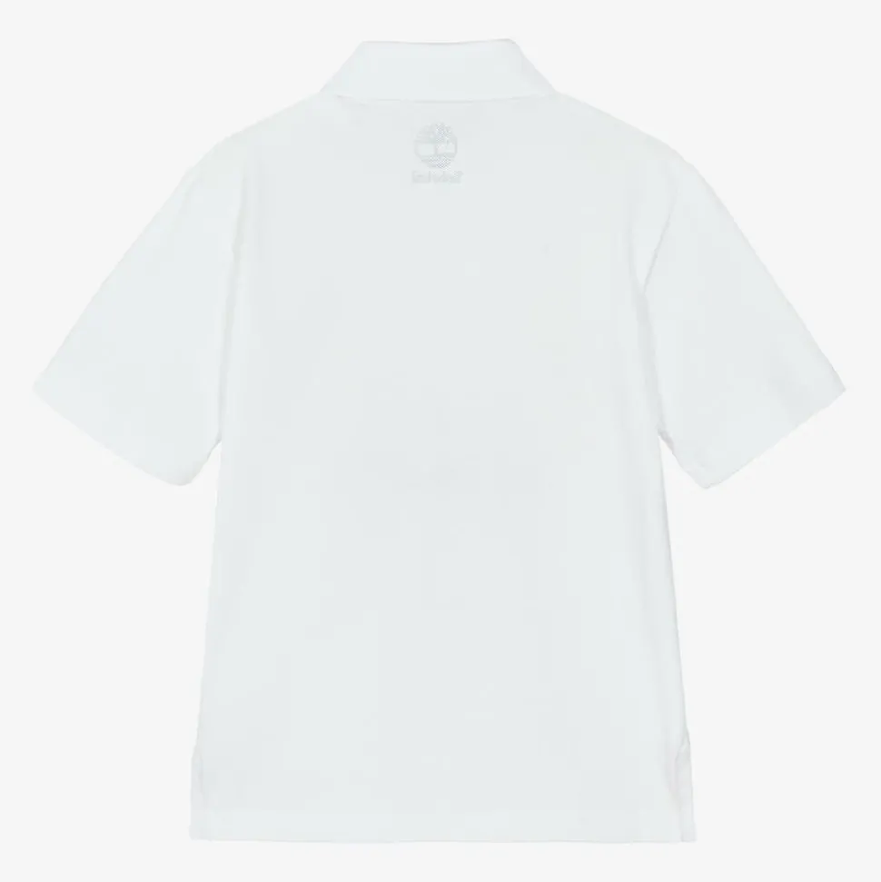 White short-sleeved polo shirt for boys by American brand Timberland, with the signature tree logo printed on the front in yellow. Made in soft organic cotton piqué, it has a ribbed collar, branded button fastenings on the placket, and vented side seams.