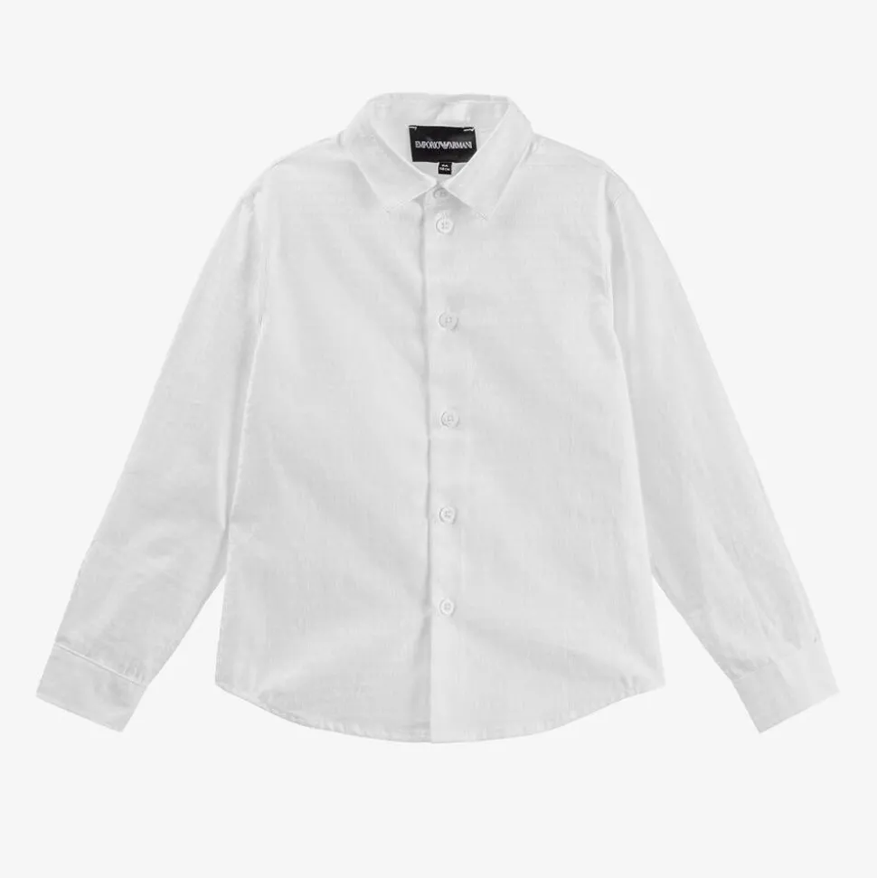Boys off-white cotton shirt from Italian label Emporio Armani, made in soft, lightweight poplin. Ideal for those smarter occasions, this long-sleeved shirt has a subtle jacquard logo pattern for a stylish, designer look. It fastens neatly on the front and cuffs with branded buttons.