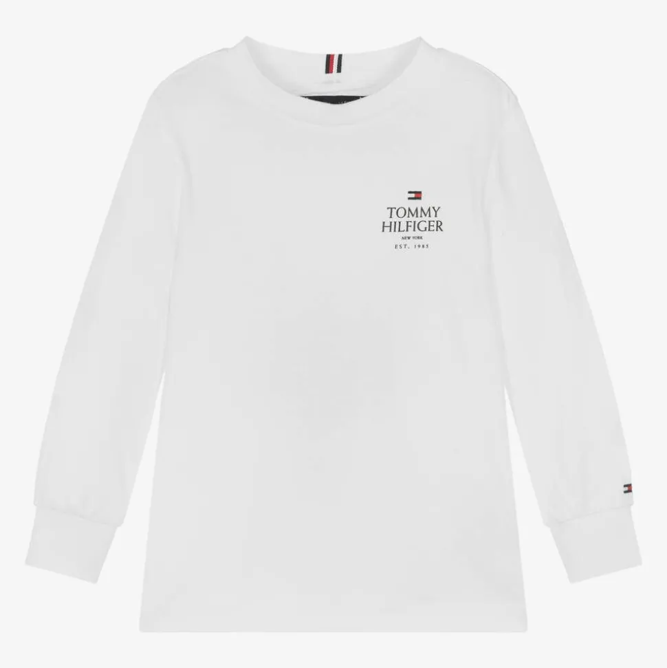 White long-sleeved top for boys by Tommy Hilfiger, made in soft cotton jersey. This classic, casual top has a navy blue logo printed on the front with the brand's iconic flag logo above for instant recognition. For added designer appeal, there is a further flag logo embroidered on one sleeve and signature striped detailing on the back of the neck.