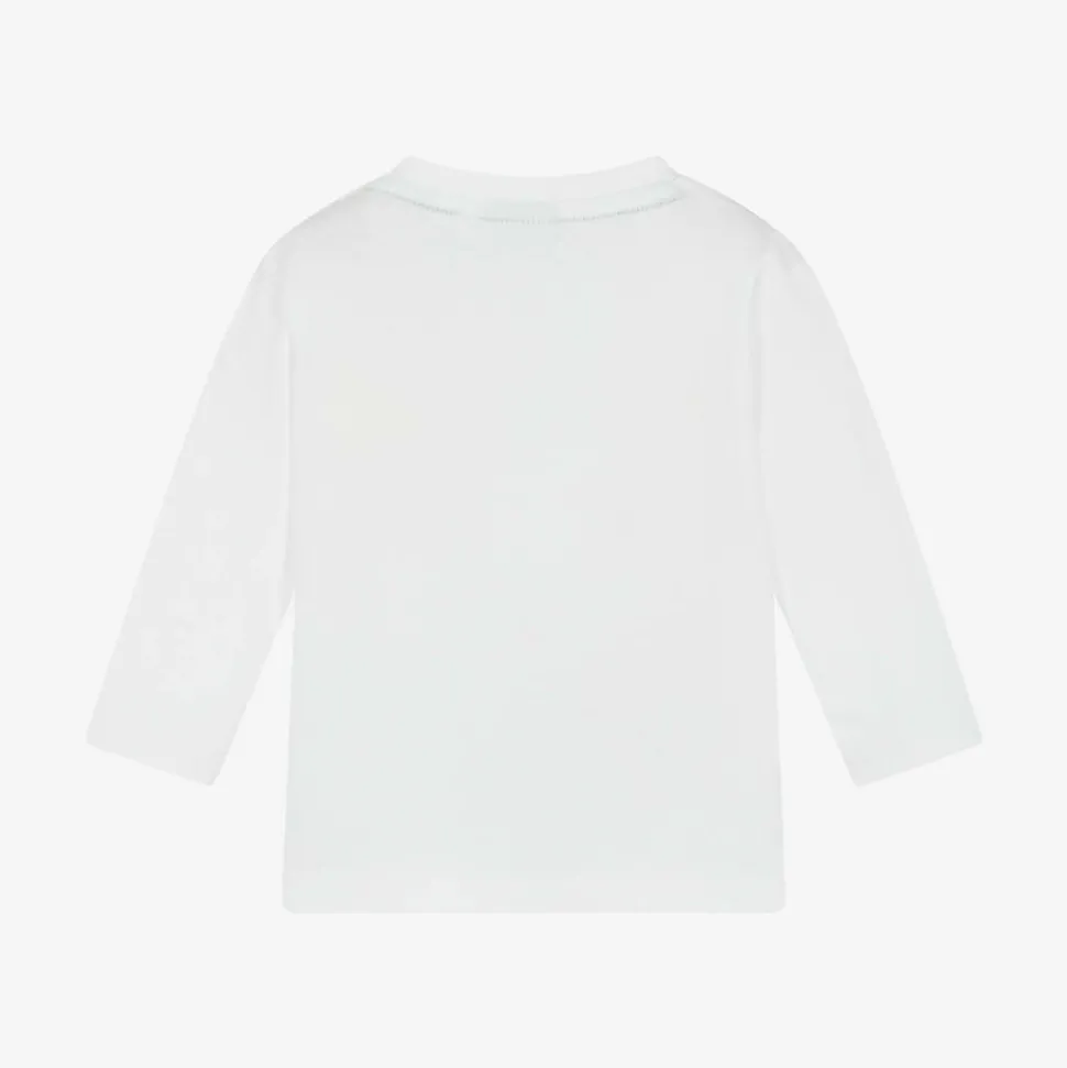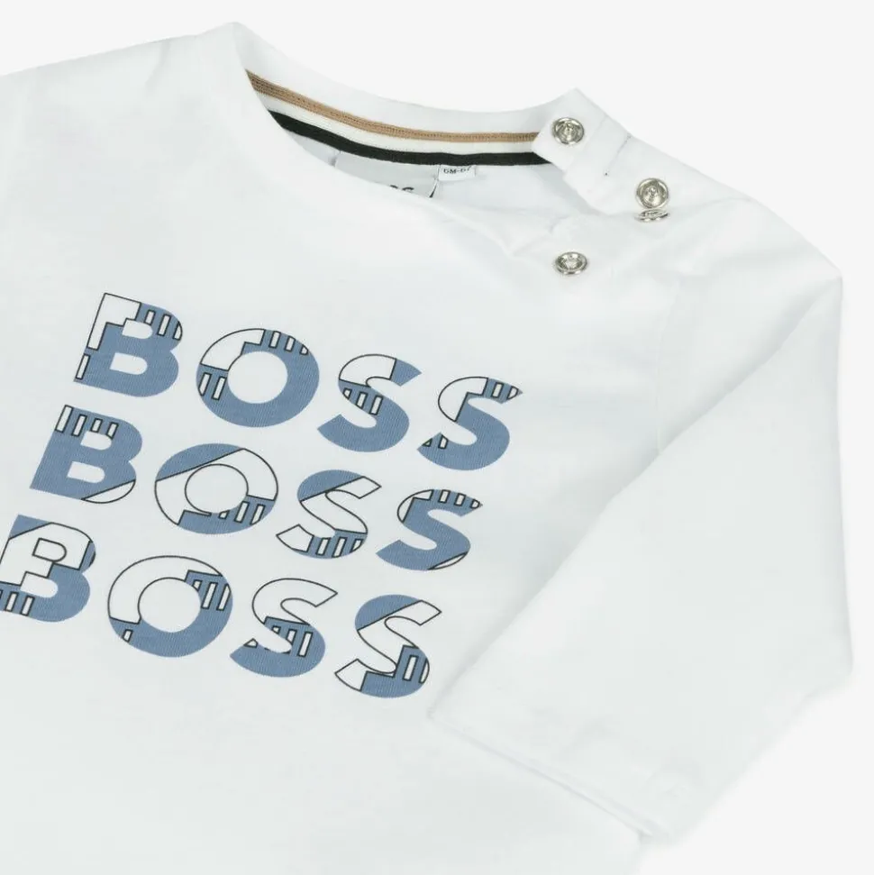 White long-sleeved top for little boys by BOSS, made in soft cotton jersey. Comfortable against delicate skin, this slim-fitting top has a trio of blue and white logos printed on the front and branded popper fastenings on one shoulder for easy dressing.