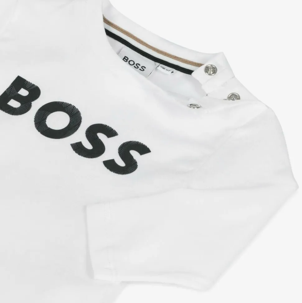 White long-sleeved top for little boys by BOSS, made in soft cotton jersey. Comfortable and easy-wearing, this casual top has a black rubberised logo across the front, for an instant designer statement, and popper fastenings on one shoulder for easy dressing.
