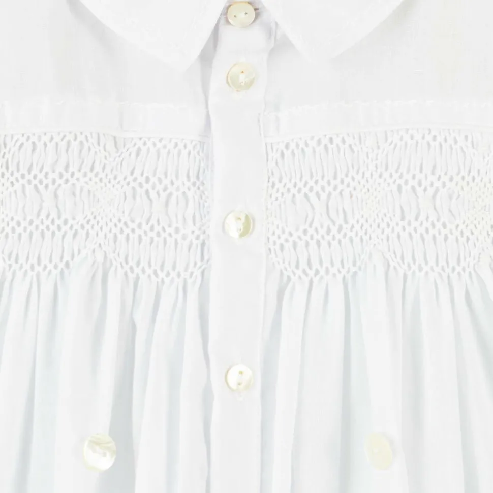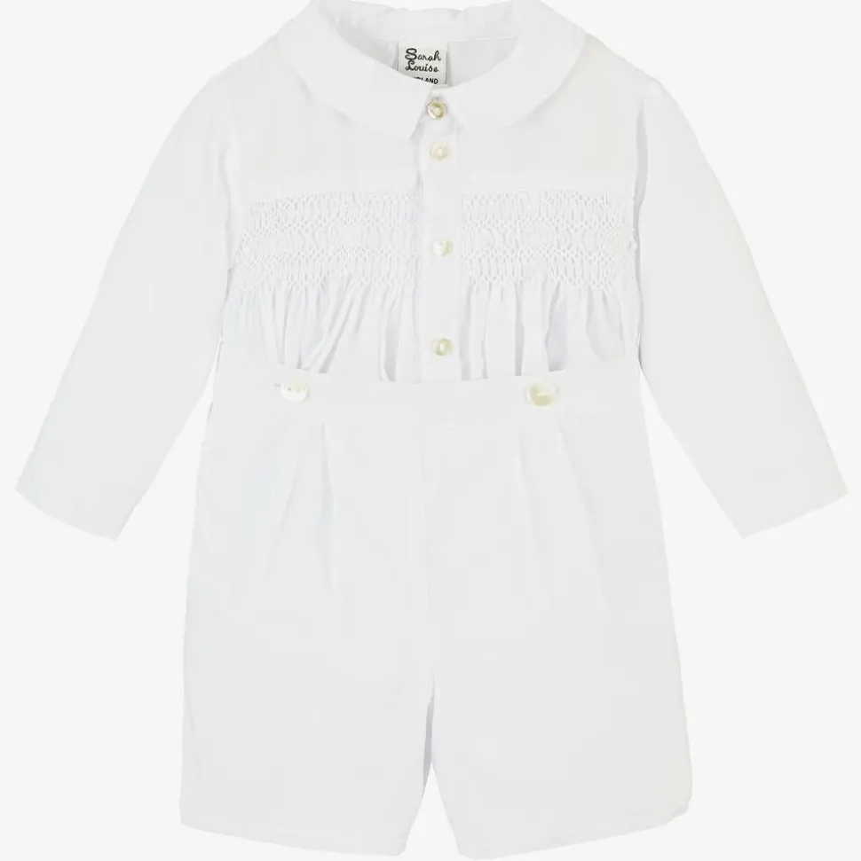 Traditional buster suit for little boys by Sarah Louise, made in soft and lightweight cotton blend. The white shirt is beautifully hand-smocked and hand-embroidered, with embroidered trim on the collar and cuffs. The lined, white shorts have pleats on the front and an adjustable waistband. Both pieces fasten together so that the shirt will always stay neatly tucked in.