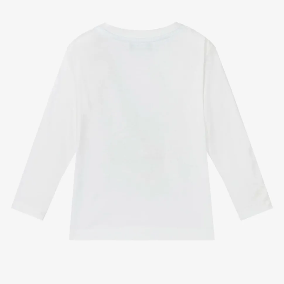 White long-sleeved top for little boys by Monnalisa, made in soft organic cotton jersey. Lightweight and comfortable, this casual top has Disney's adorable Dumbo character printed on the front in blue. It fastens with branded buttons on one shoulder.
