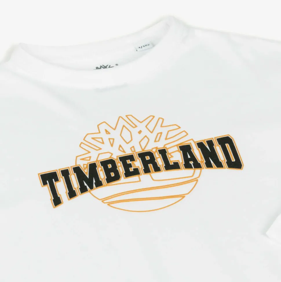White long-sleeved top for boys by Timberland, made in soft organic cotton jersey. Cool and comfortable, this casual top features a rubberised black and gold logo printed on the front along with the brand's iconic tree illustration.