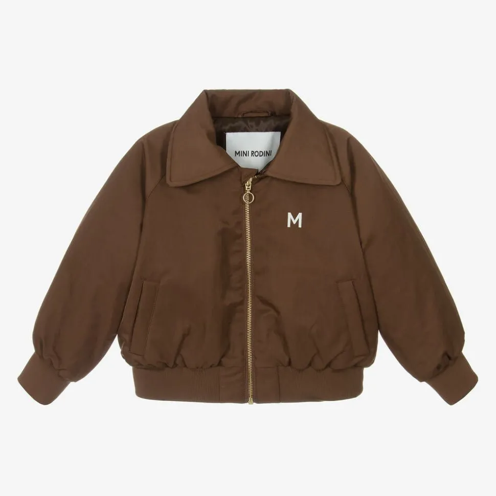 From Mini Rodini, brown bomber jacket for boys and girls. Made in silky smooth, water-repellent fabric this warm jacket is finished with cartoon cats on the back in a style synonymous with the brand.
