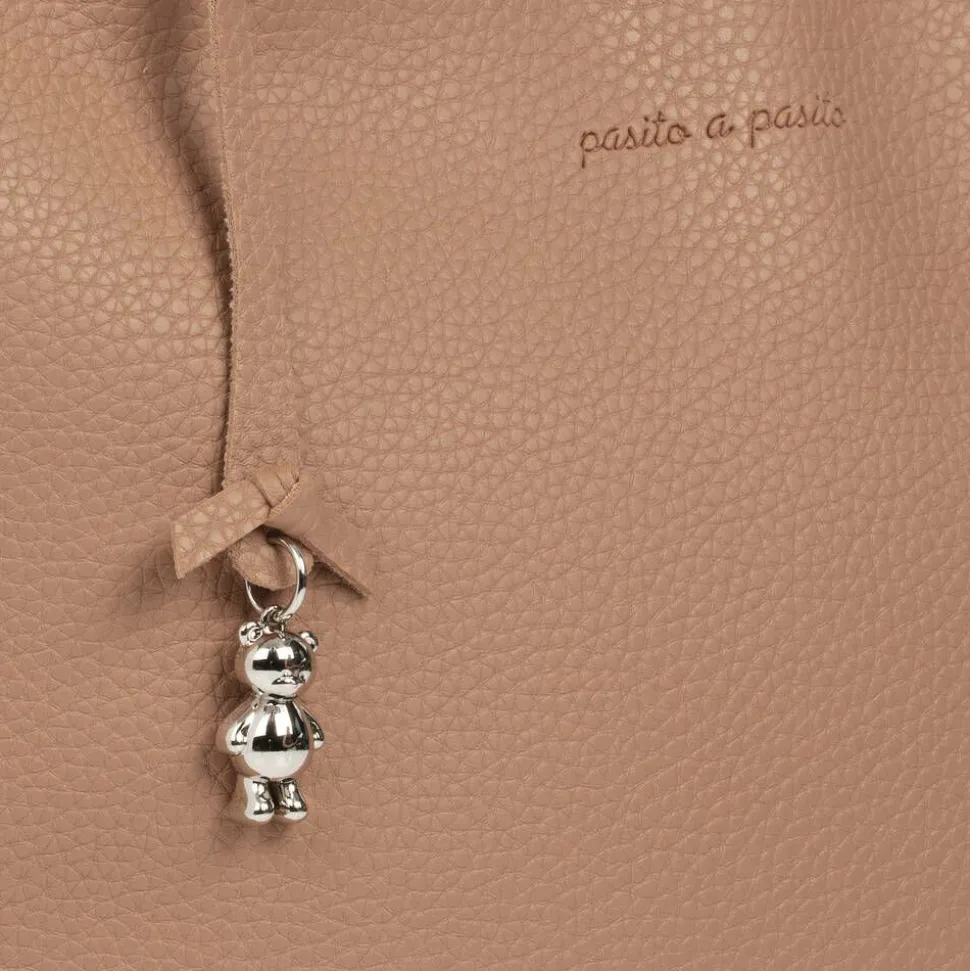 Designed for style and functionality, this brown faux leather bag from Pasito a Pasito has a lovely, grained finish and an embossed logo on one side. Waterproof and fully washable, it has a branded satin lining and useful internal pockets, including a thermal pocket for bottles and a secure zip fastening. It comes with a detachable shoulder strap and popper-fastening stroller straps, with an attached silver metal teddy charm to complete the look.