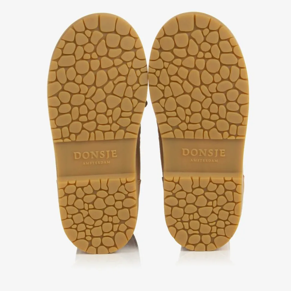 Brown boots for boys and girls by Donsje, handmade in soft leather. Adorable to wear on colder days, these shoes are lined in beautifully cosy wool and have a sturdy, non-slip outer sole. For added character, they have cute koala faces on the front with 3D ear appliqués.