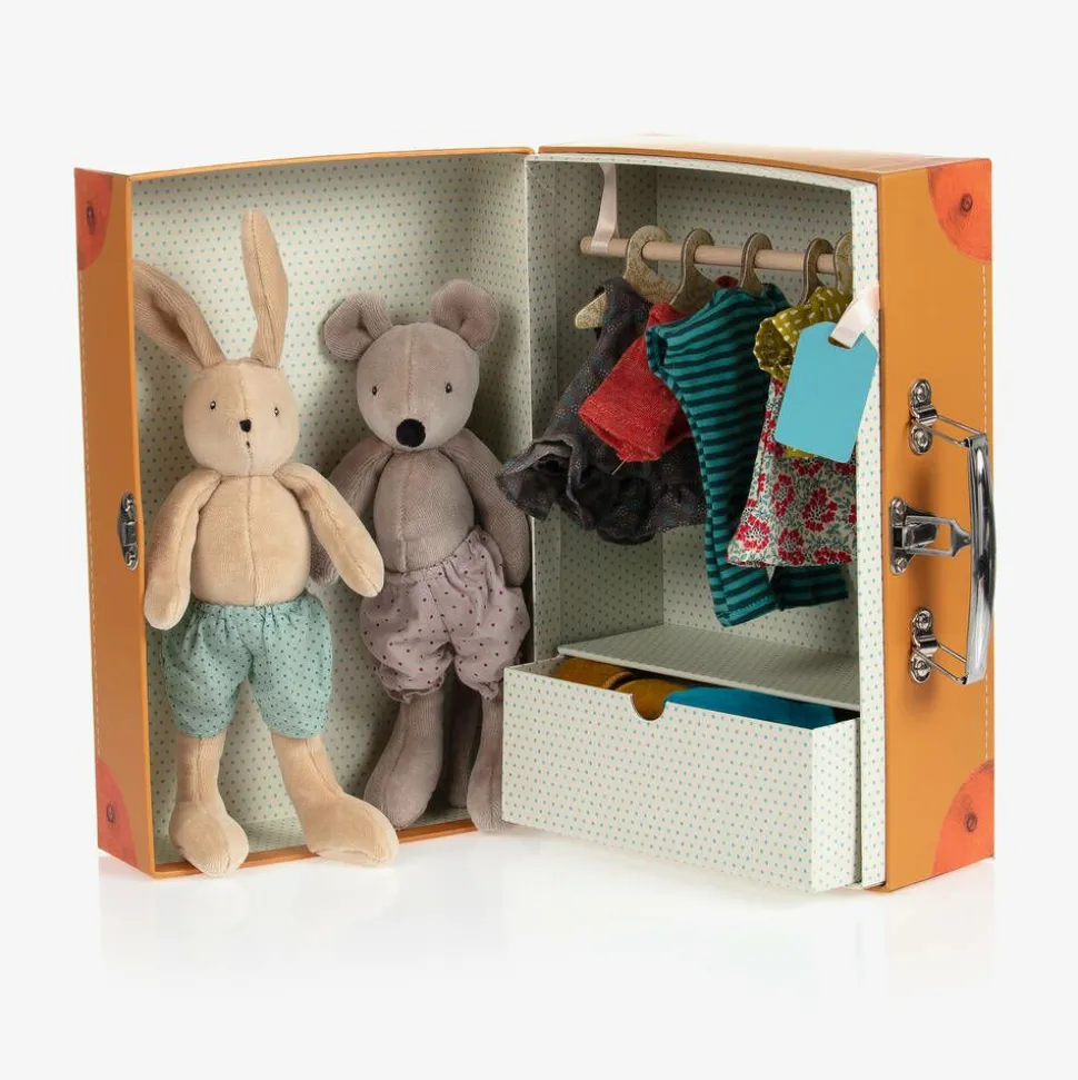 A delightful beige bunny and grey mouse dress-up toy for boys and girls by Moulin Roty. Made from softly padded velour, Nini Mouse and Sylvain Rabbit have sweet embroidered faces and cute ears. Beautifully presented in an orange wardrobe box with a metal handle and clasp on the outside, this set is easy to carry and tidy away. Inside they have a hanging rail, hangers, and a drawer to store their lovely selection of clothing, including bloomers, tops, dungarees, and dresses. Some of the clothes have velcro fastenings and others easily slip on, for endless dress-up fun.