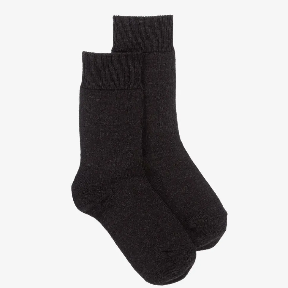 Girls and boys dark grey mid-length socks from Falke, made in a luxuriously thick and stretchy wool blend, with a soft cotton inside. They have comfortable ribbed cuffs, with reinforced stress zones for added durability.