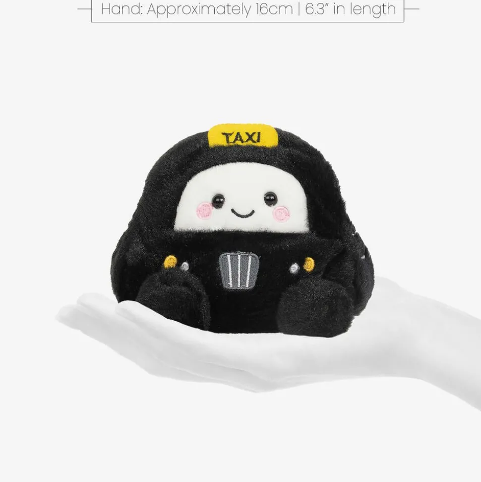 Freddie Black Taxi soft toy for boys and girls by Aurora, handmade in super soft plush. Part of the Palm Pals Momento Collection, this cute black taxi is inspired by the iconic London black cabs and has a smiling embroidered face, bead eyes and cute feet. Filled with recycled fibres and pellets, this fun collectable is designed to fit comfortably in the hand, sitting upright with the help of the beads in the bottom. This charming toy is suitable for all ages.