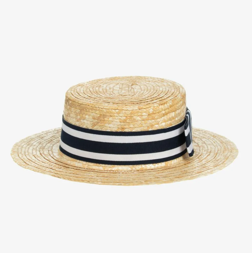 Traditional light beige straw hat for girls by British heritage brand Beatrice & George, exclusive to Childrensalon. Timeless and stylish, it has a navy blue and white striped grosgrain ribbon trim, with a smart bow on one side.