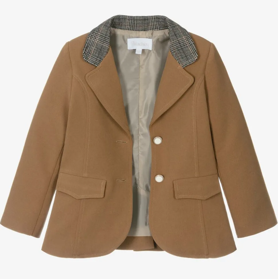 Dark beige blazer for girls from Patachou, made in soft, woven crêpe with a slight stretch. With a traditional look, it is styled with brushed cotton check detailing on the lapels, gold-trimmed, ivory button fastenings on the front, and useful flap pockets. It has a satin lining for comfort, the shoulders are padded lightly for shape, and the vented section on the back allows for freedom of movement.