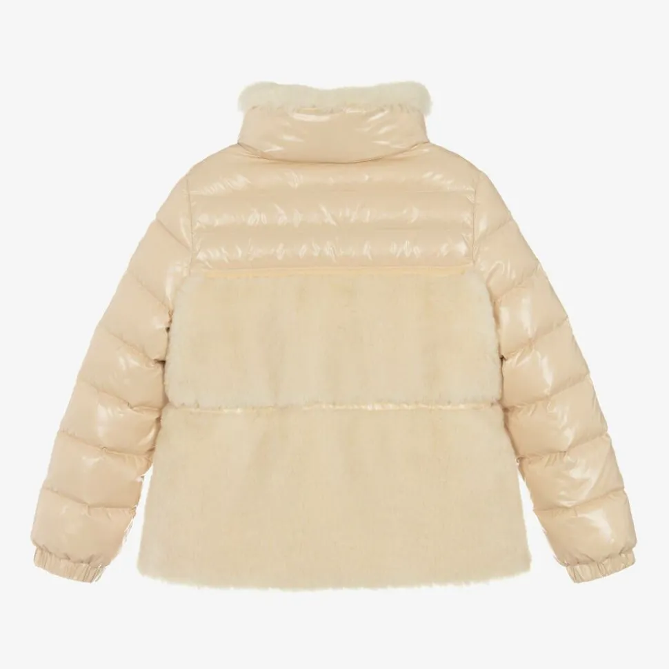Stylish beige jacket for girls by luxury Italian designer, Moncler Enfant. Padded with warm down for a cosy fit, this outerwear piece has snuggly sherpa fleece on the front and back and an elasticated waist for shape. Styled against the high-gloss fabric for a contemporary look, it fastens with a shiny gold zip on the front and has popper-fastening front pockets. The elasticated cuffs help to keep out cold chills, and the silky lining ensures a comfortable fit. The iconic felt logo badge is appliquéd on one sleeve for a branded touch.
