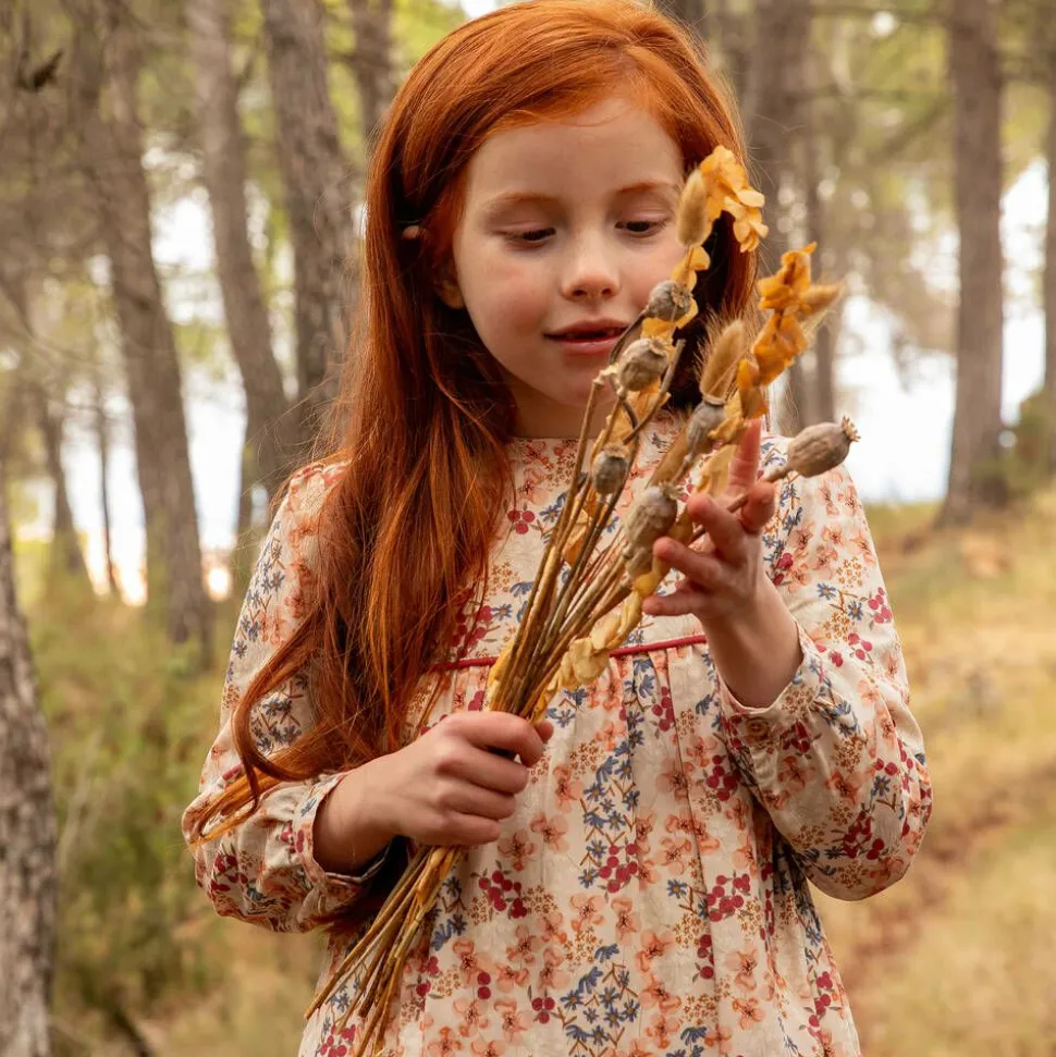 Delightful beige long-sleeved dress set for girls by Tutto Piccolo. Made from soft cotton and viscose blend twill, it has a muted red, blue, and coral orange floral pattern, a frilled hemline, and piped detailing across the chest. With a lovely floaty silhouette, it has a concealed zip fastening on the back and neatly buttoned cuffs. The outfit is complete with a pair of lovely burgundy red knitted ankle socks, decorated with grosgrain ribbon bows.