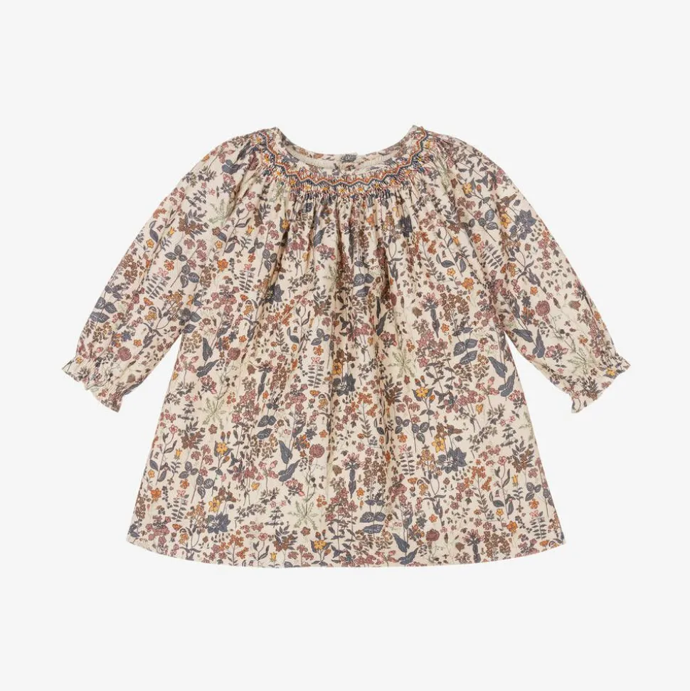 An enchanting pale beige long-sleeved dress for little girls by luxury brand Bonpoint. Made from soft cotton needlecord with a lightweight lining, it is patterned with a charming Liberty floral print in muted shades of blue, orange, and dusky pink. This heritage piece has a beautifully hand-embroidered smocking, created using unique artisanal and traditional techniques. It fastens neatly with pearlescent buttons on the back and has gently elasticated cuffs.