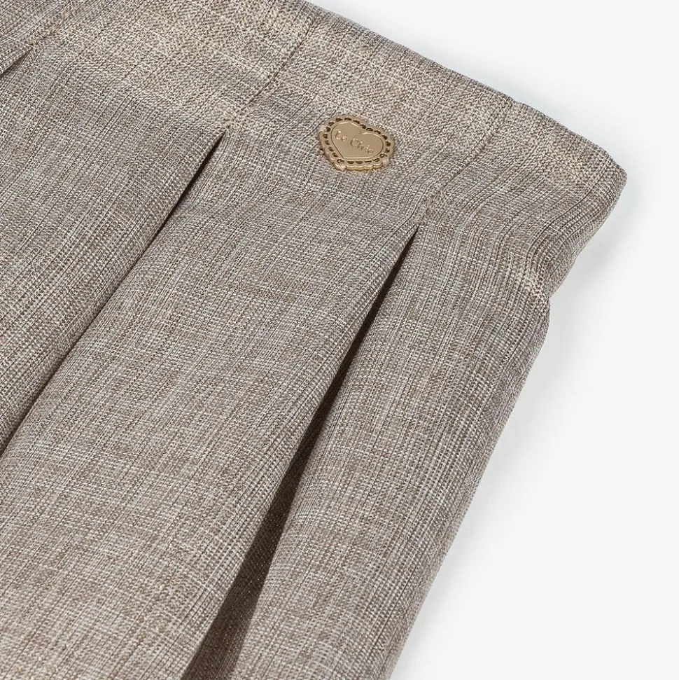 Beige special occasion shorts for girls by Le Chic, shimmering with gold thread. Pleated and lined in soft satin, they have a semi-elasticated waistband for a comfortable fit. Easy to wear, they simply pull up.