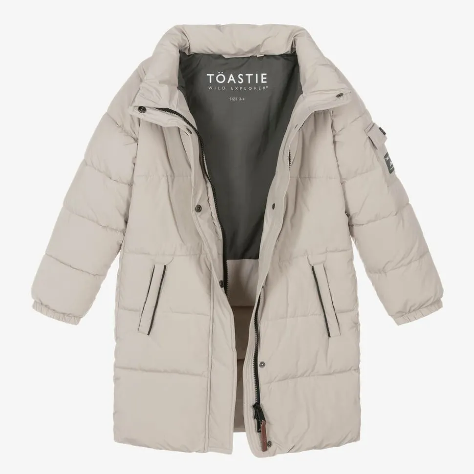 Beige hooded parka coat for girls by British brand Töastie. The exterior is water-repellent and made from recycled materials, with breathable padding and a comfortable lining. The spacious, peaked hood is lined in cosy fleece and has a detachable, soft faux fur trim. There are practical pockets and it fastens with a zip beneath a popper storm flap. The brand's logo patch can be seen on one sleeve to complete the look.