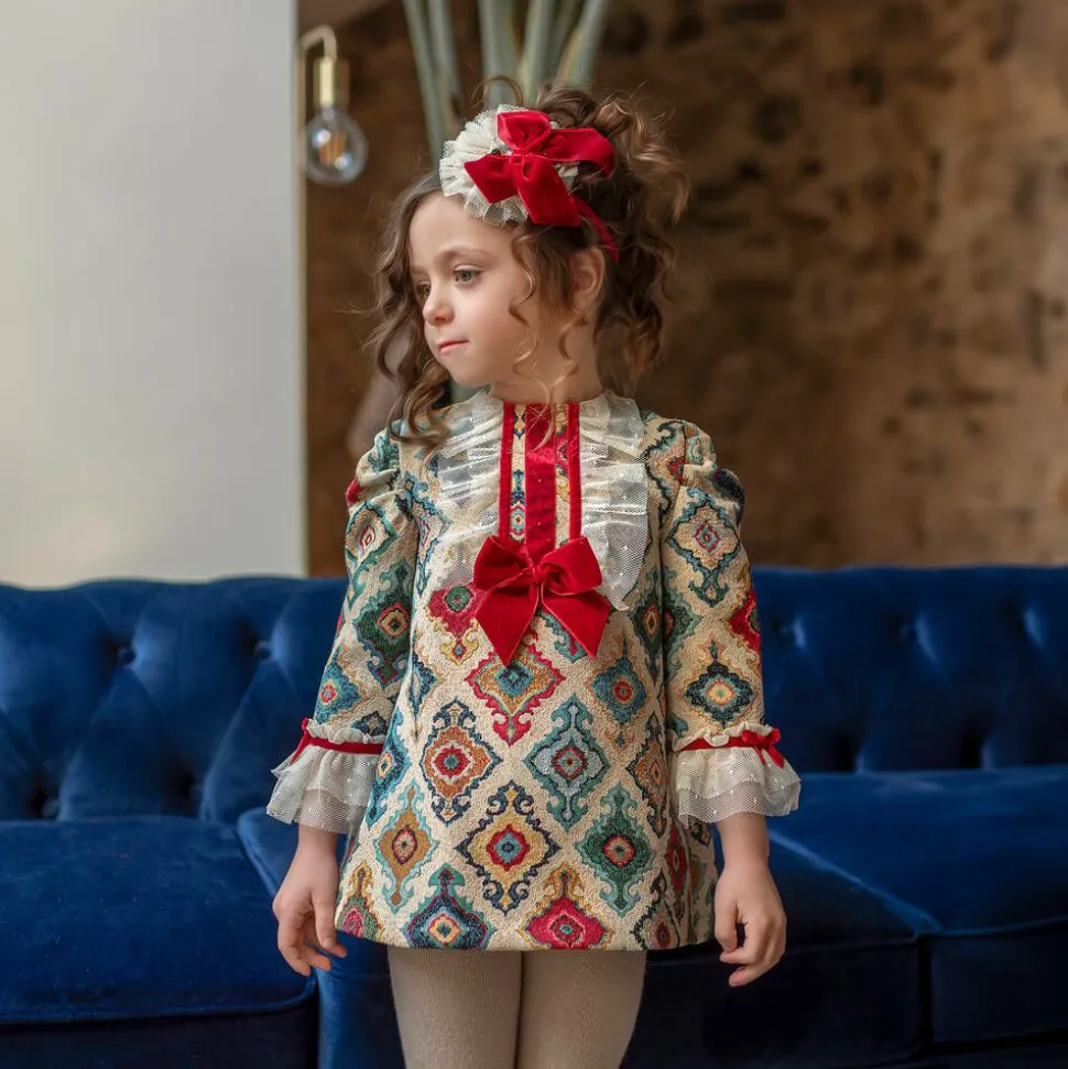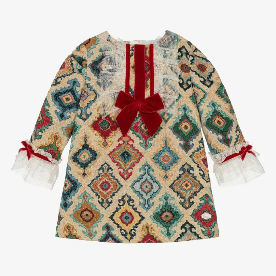 Pretty beige dress for girls by Miranda, woven in a soft cotton-blend. Ideal for special occasions, this beautiful dress has an ikat jacquard design in red, green and blue. It has gorgeous plumeti tulle and red velvet ruffle trims and stylish three-quarter-length sleeves. Lined in soft cotton-blend voile for comfort against the skin, it fastens with a concealed zip on the back.