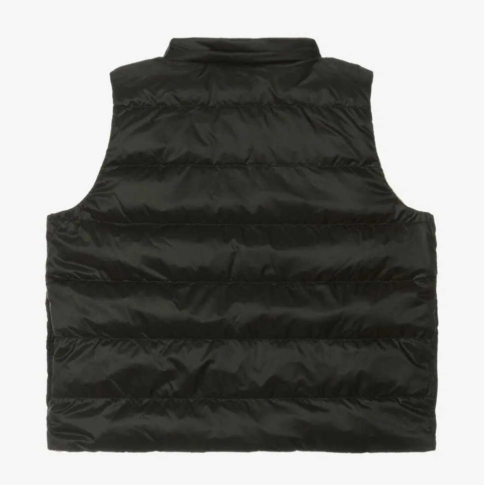A reversible beige gilet for girls by luxury British designer Burberry, in a smooth fabric with a lightweight down filling. Unmistakably Burberry, their distinctive oversized check is redesigned in a modern basket weave print. The reverse is plain black with side seam pockets for an alternative look. This gilet fastens with poppers and has a removable zip-on hood.