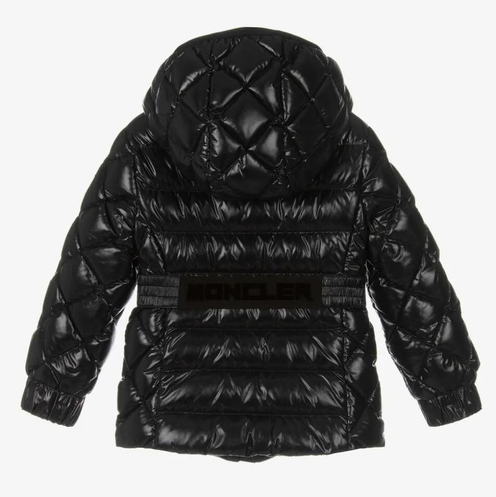 Black diamond quilted jacket for girls by luxury French brand Moncler Enfant, with the iconic logo patch in tonal black on one sleeve. For a feminine silhouette, it is styled with a removable belt with a black, raised velvety logo lettering, popper fastenings and elasticated sides. Silky smooth and water repellent, this hooded jacket is down padded for optimum warmth. It fastens with an easy zip on the front and pockets.