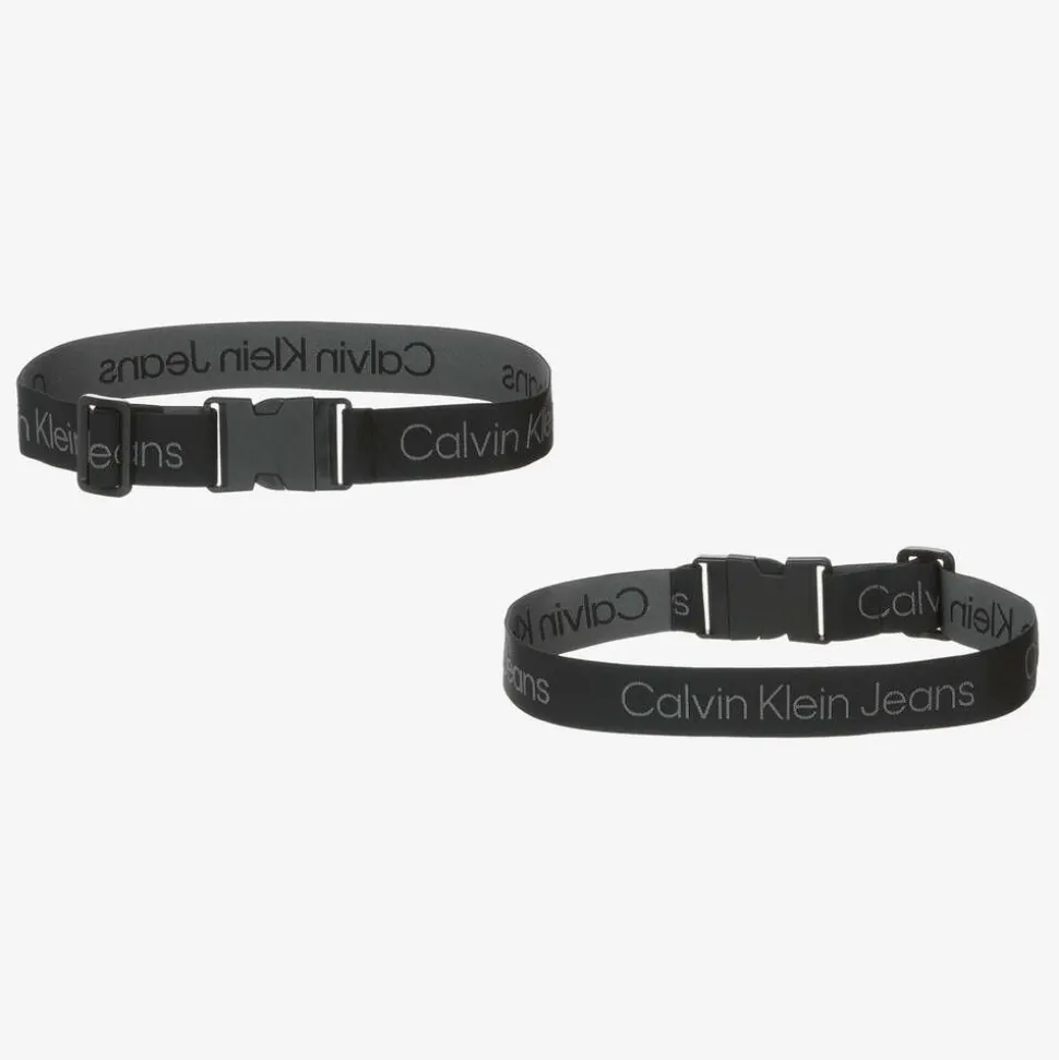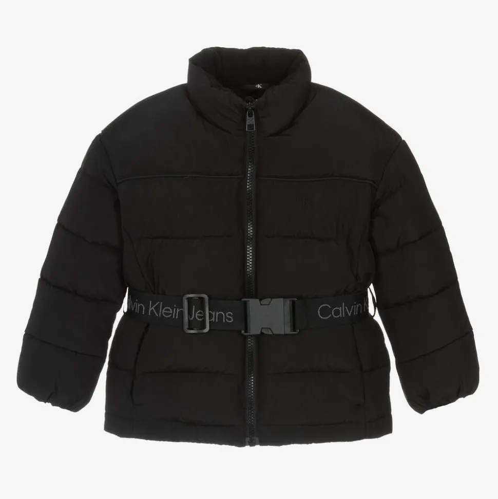 Black belted puffer jacket for girls by Calvin Klein, made in silky smooth fabric with mid-weight padding. Ensuring warmth during the colder months, this slim-fit design has a full zip front and long sleeves with elasticated cuffs. The stand-up collar is lined with cosy polar fleece and the silky interior is printed with a Calvin Klein Jeans logo. To shape the waist, the elasticated belt is fully adjustable and fastens with a branded clip buckle. A monogram logo, in tonal embroidery, adds further designer detail to the chest. The outer material and lining are made with at least 95% certified recycled material.