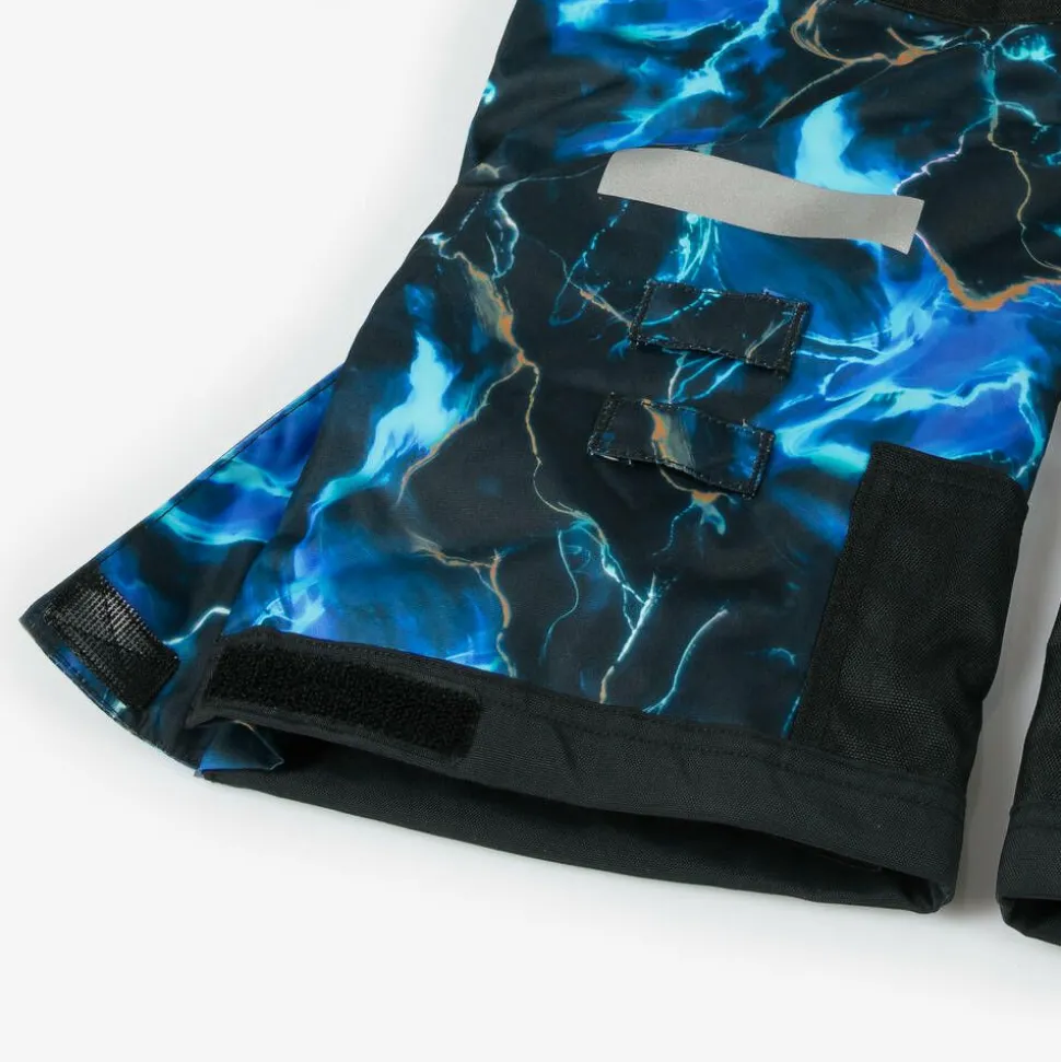 Black technical snowsuit and cosy snood set for boys by Deux par Deux, with a bright blue storm print. It has high performance Primaloft insulation provides excellent warmth, whilst the eco-friendly Bionic Finish is water-repellent, breathable and quick-drying. Fastening with a zip and velcro, it has a soft and cosy fleece lining, a detachable large hood and internal elasticated straps so the suit can be carried hands-free when not in use. Additional features including sealed seams, Cordura reinforced parts for abrasion resistance, internal gaiters, inner pockets for googles and a ski pass pocket make it slope-ready. The length of the sleeves and cuffs can also be easily extended as your child grows.