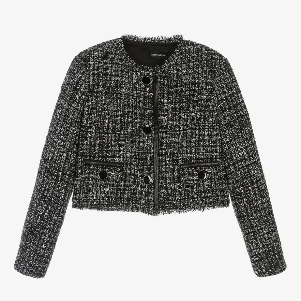 A black and ivory jacket for girls by Italian designer Monnalisa, made in cotton blend. Effortlessly elegant and stylish, this bouclé tweed jacket has shiny metal buttons on the front, faux leather trims, and fringed edges. Styled in a slightly cropped fit, it has faux front pockets and a logo-jacquard satin lining.