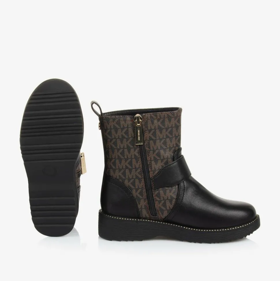 Black and brown faux leather boots for girls by Michael Kors Kids, patterned in the designer's signature MK monogram. They have branded gold metal hardware, studded detailing, and a decorative buckle strap. Lined in sparkly soft textile, with chunky non-slip rubber soles, they fasten with a side zip and have a useful heel tab.
