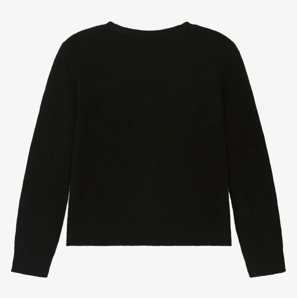 Gorgeous black cardigan for girls by French brand Bonpoint, knitted in luxurious cashmere for a beautifully soft feel. This stylish, warm layering piece is elegantly embellished on the front and sleeves with sparkling diamantés, shimmery beads and floral embroidery. It has a rounded neckline, lightly ribbed trims and classic button fastenings.