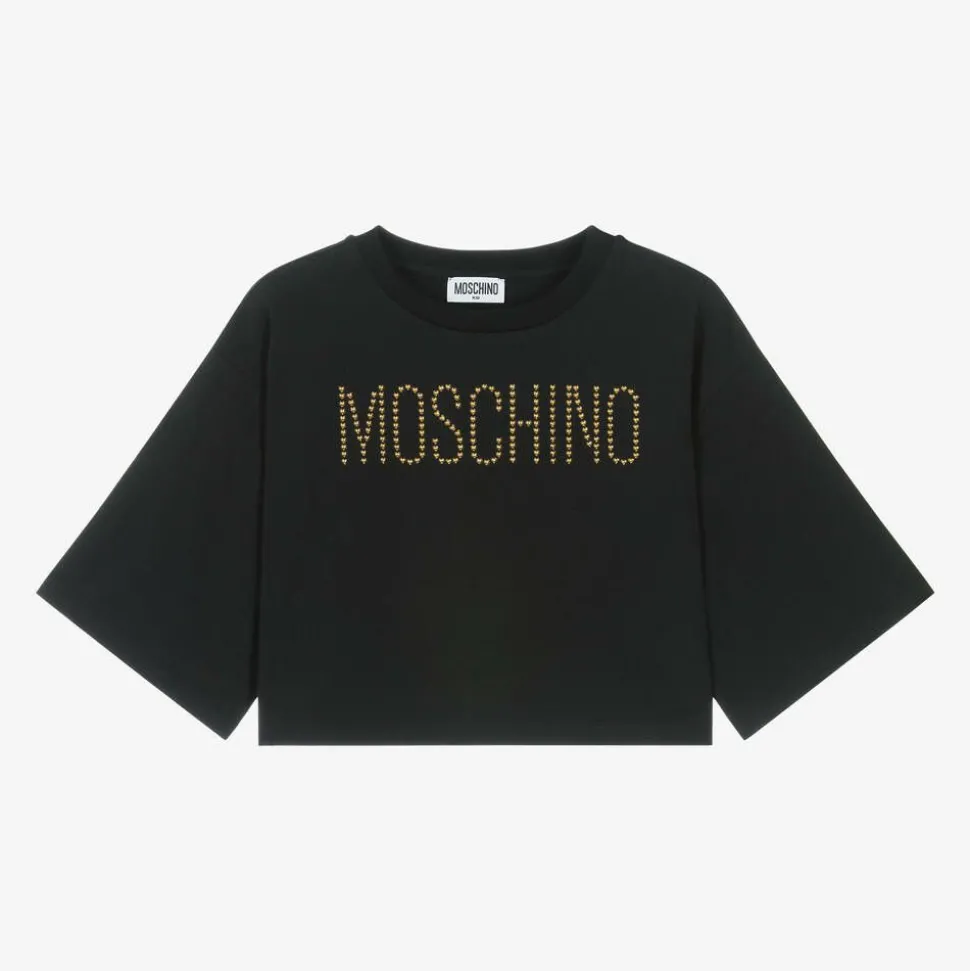 Stylish black T-shirt for girls from Moschino Kid-Teen, made in soft cotton jersey. In a relaxed boxy fit, this casual top has dropped shoulders and oversized short sleeves. The Italian designer's name features boldly on the front in gold heart-shaped studs, for instant brand recognition.