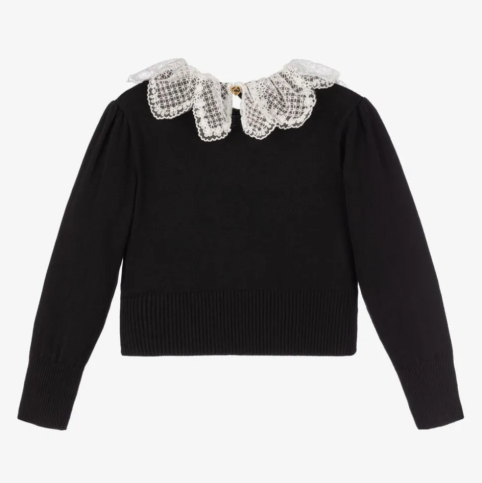 A softly knitted black cotton sweater for girls by Angel's Face. It features a beautiful floral lace white collar and pretty puffed sleeves. Fastening with a single heart button on the back, it has the brand's signature grosgrain bow and golden heart charm on the chest.