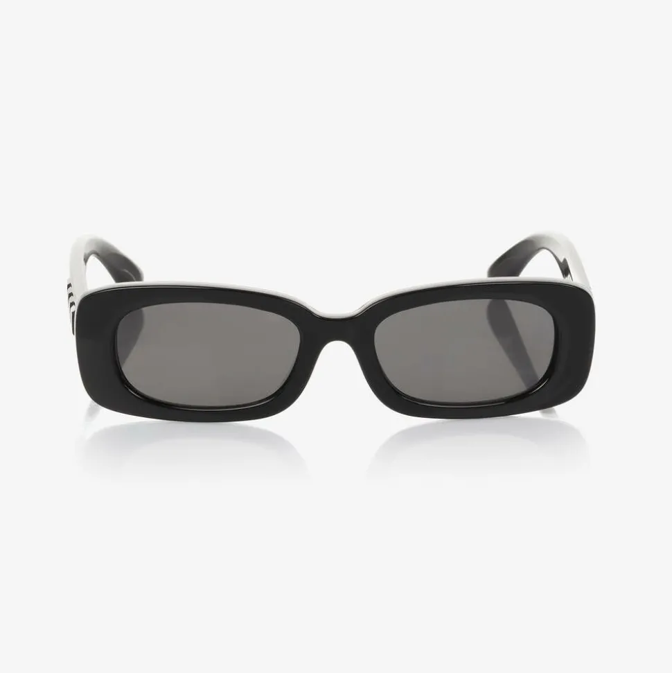 Black sunglasses for girls by luxury Italian label Dolce & Gabbana. Stylish and practical for shielding her eyes from the sun, they have dark grey tinted lenses. Adding a playful, branded touch, the designer's DG crossover logos can be seen on the arms, along with red star and happy face motifs. For safe storage, they come with a branded silicone case in vibrant green and orange, with a pink carabiner clip.